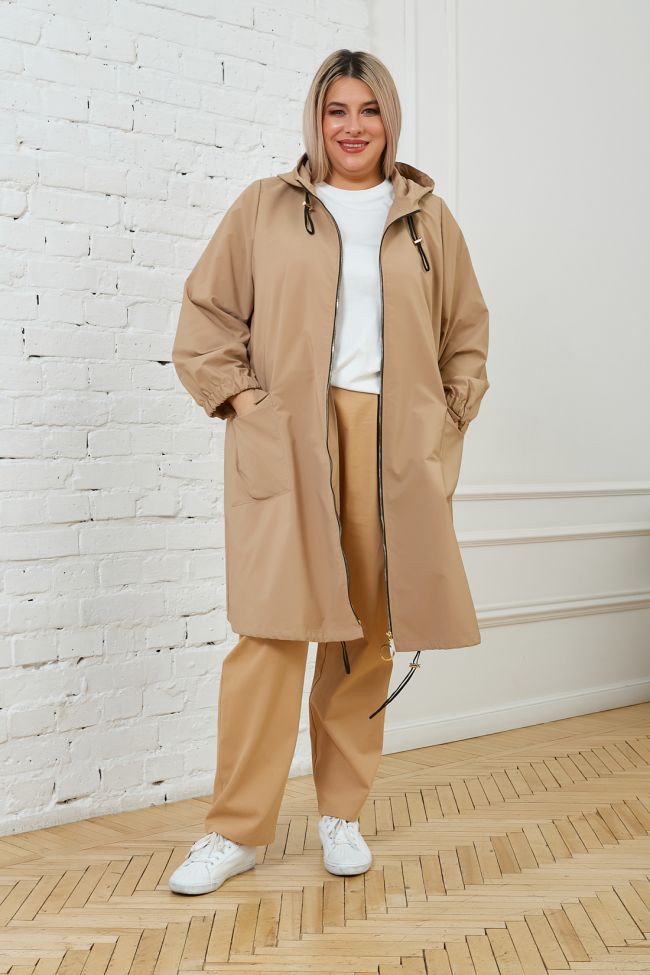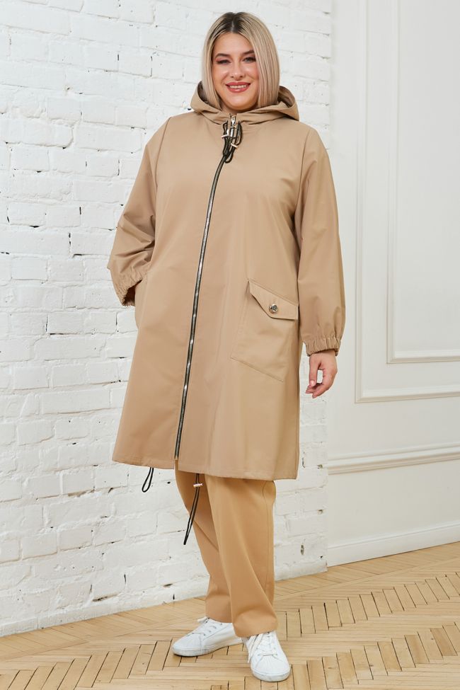 бежевый Стильная парка трапециевидного силуэта из плащевой однотонной ткани без подклада. Круглый вырез горловины дополнен шлемовидным капюшоном со шнуром и фиксаторами.  По переду - центральная застежка на тесьму-молнию. Длинные втачные рукава, с широкой резиной по низу. По переду большие накладные карманы с клапанами, удобно расположенные по линии бедер. Спинка со швом по центру, оканчивающимся разрезом. Низ ровный дополнен шнуром и фиксаторами. Темп.режим от +10 до +20
