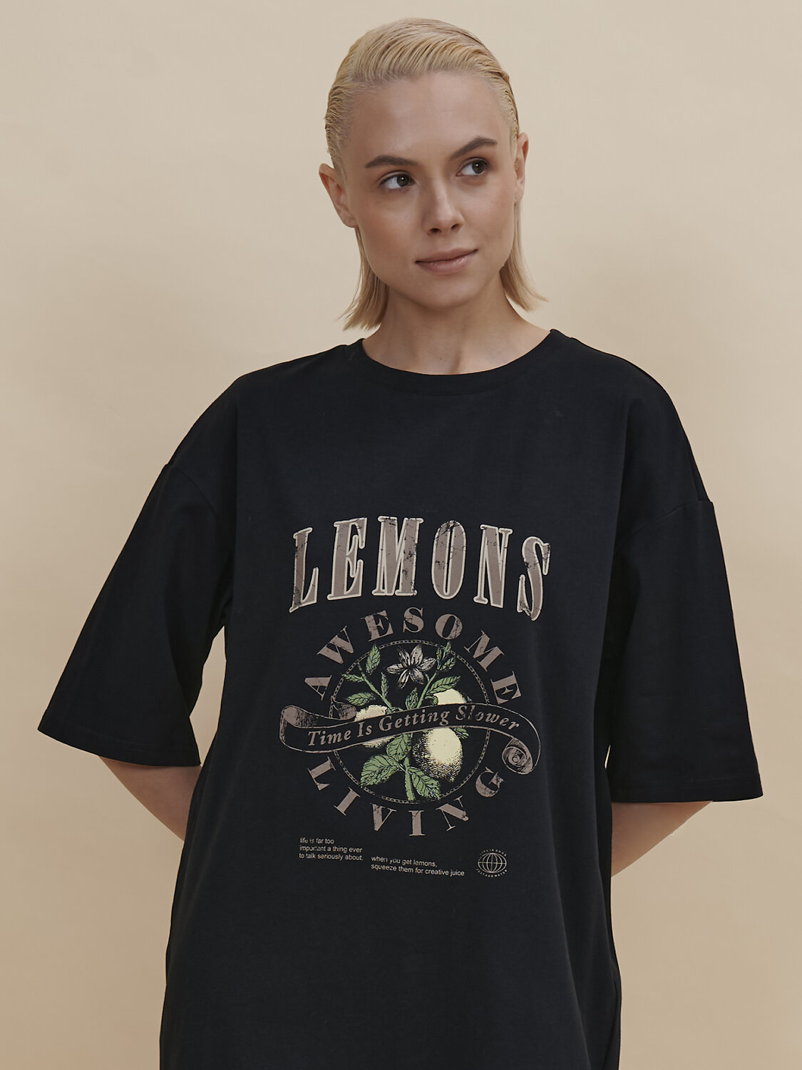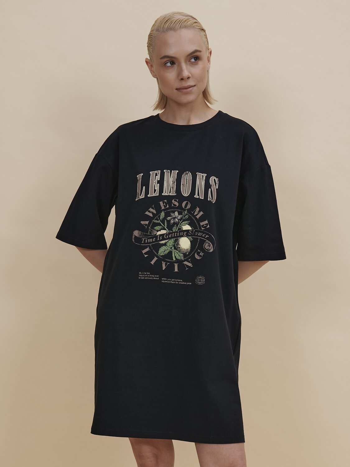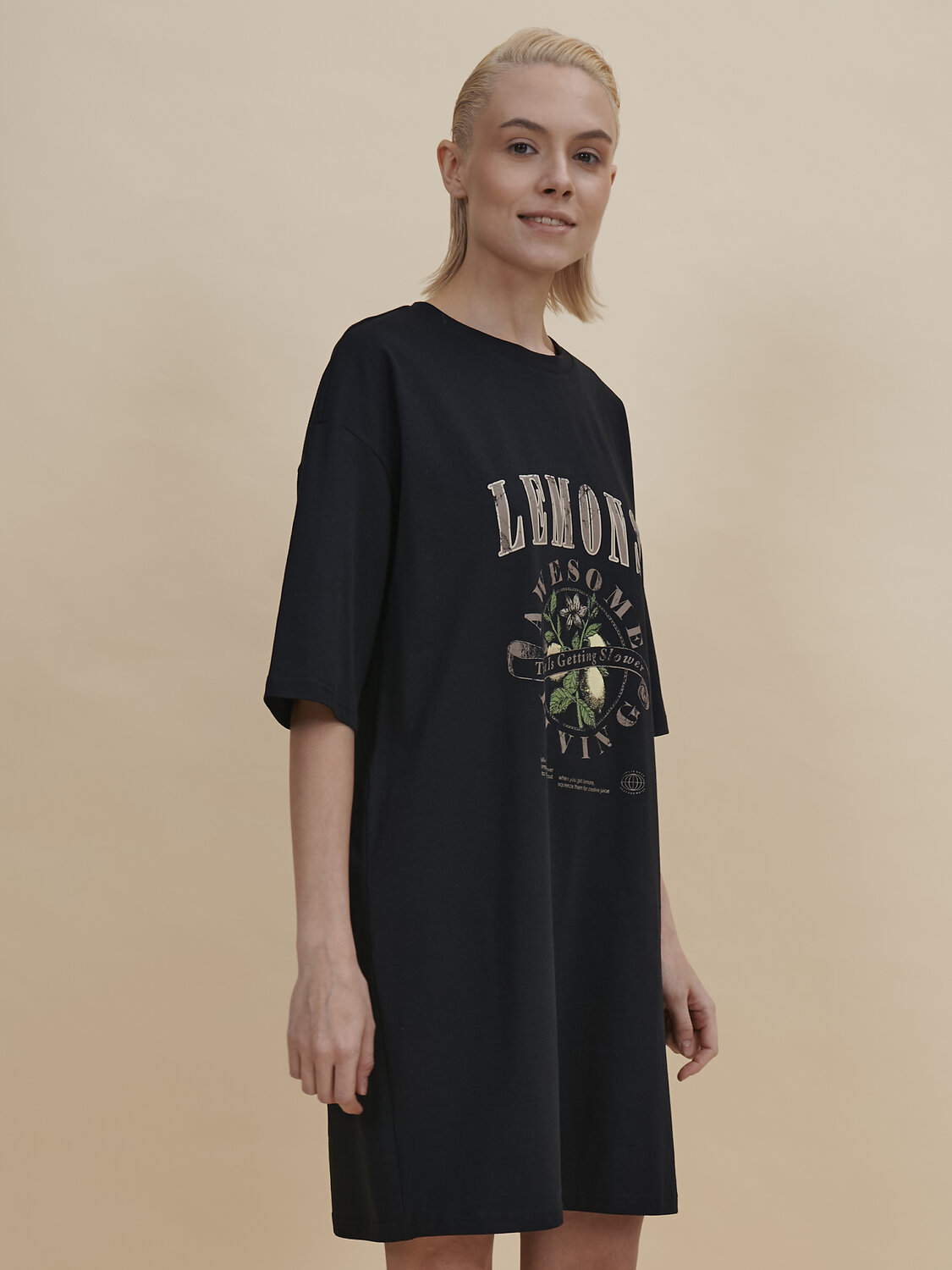 Стильное женское летнее платье футболка длиной до колена. Трикотажное платье оверсайз прямого кроя с коротким рукавом. Однотонное платье-футболка с принтом – базовый элемент женского гардероба. Повседневное платье свободного кроя подойдет для любой фигуры. В составе ткани изделия преобладает высококачественный хлопок – платье мягкое и отлично пропускает воздух, позволяя коже дышать. Эластан помогает модели надолго сохранить первоначальную форму. Стильный и актуальный принт в духе садоводческих клубов эластичный и прочный, отлично переносит многочисленные стирки. Надписи переводятся: "лимоны", "потрясающее времяпрепровождение", "время идёт медленнее", "жизнь — слишком серьёзная штука, чтобы говорить о ней всерьёз", "когда вы возьмёте лимоны, выжмите из них творческие соки", "жизнь хороша", "просто добавь воды". В линейке представлены следующие размеры: XS (42), S (44), M (46), L (48), XL (50). Просторное платье в спортивном стиле подходит как женщинам, так и девушкам, девочкам-подросткам. Модель представлена в следующих цветах: чёрный, голубой, синий, жёлтый, бежевый, зелёный. Свободное платье оверсайз идеально для носки дома, комфортного сна, пижамной вечеринки. Платье майка подходит для повседневного летнего гардероба, прогулок, отдыха, пляжа. А также модель удобна для беременных. Женское трикотажное платье – чудесный подарок для мамы, сестры или подруги на любой праздник. Выбирайте нужный размер по таблице размеров на фото. Цвет товара на экране вашего устройства может отличаться от цвета изделия вживую.