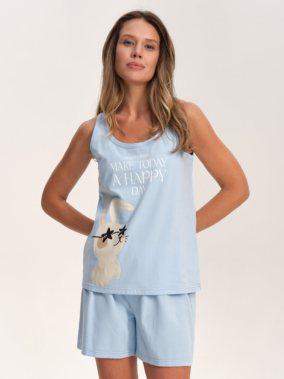 Пижама женская с шортами. В составе ткани преобладает высококачественный хлопок — комплект для сна мягкий, гипоаллергенный и хорошо пропускает воздух. В хлопковой пижаме вам будет комфортно и уютно во время сна. Эластан помогает изделию надолго сохранить первоначальную форму. Майка свободного кроя на широких бретелях дарит комфорт и свободу движений. Шорты свободного кроя, средней длины – для удобства и комфорта. Шортики женские на широкой эластичной резинке – она не давит и не перекручивается. Хлопковая пижама украшена милым, «няшным» принтом в виде забавного зайчика в очках, надписи переводятся: «хорошая атмосфера», «сделай сегодняшний день счастливым» — почувствуйте себя беззаботной девчонкой. Пижамный костюм неприхотлив в уходе. Принт эластичный и мягкий, легко переносит частые стирки. Милая пижама подходит как для сна, так и просто для отдыха дома. Помните о правильном уходе за изделием: рекомендуется стирать при температуре не выше 30 °C, без предварительного замачивания, с изнанки. Это поможет сохранить качество и цвет пижамы на длительное время. Не забывайте о выборе правильного размера. Используйте таблицу размеров на фотографии, чтобы выбрать подходящий для себя вариант. Обратите внимание, что цвет товара на экране вашего устройства может отличаться от реального.
