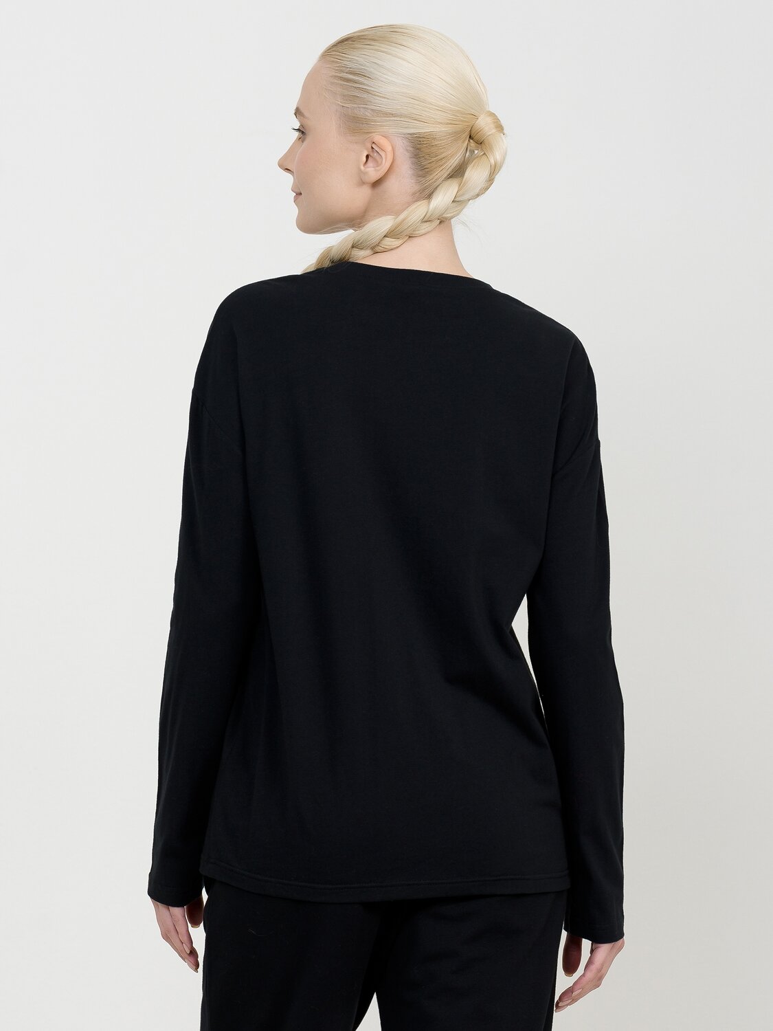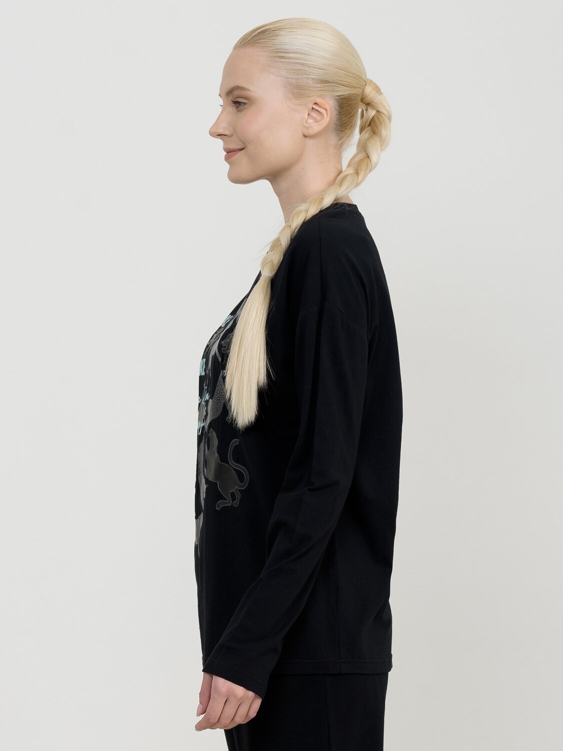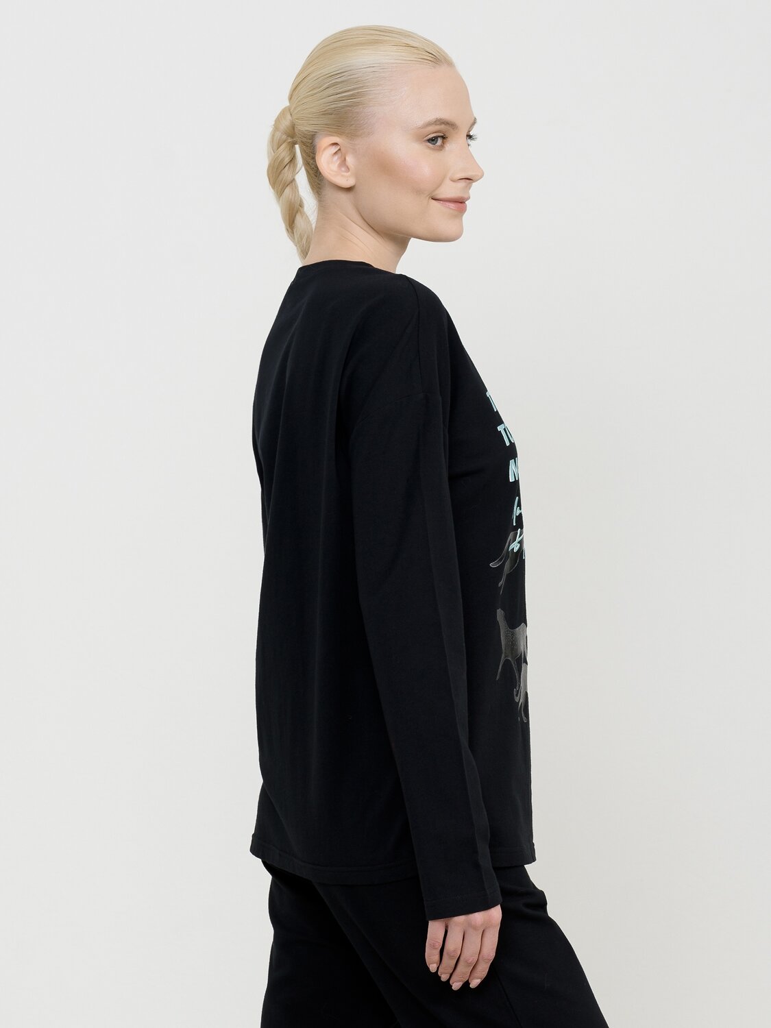 Лонгслив среднего объема. Крупный эластичный glossy принт на полутонах. Перевод Найдите время, чтобы сделать свою душу счастливой.