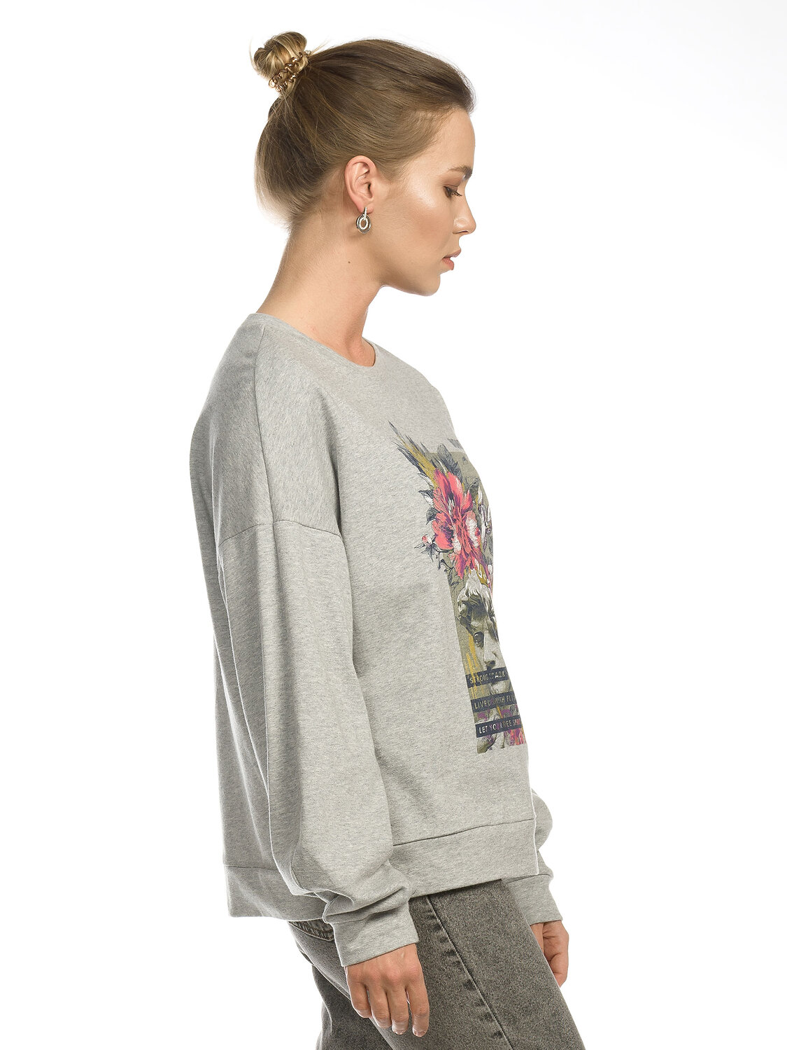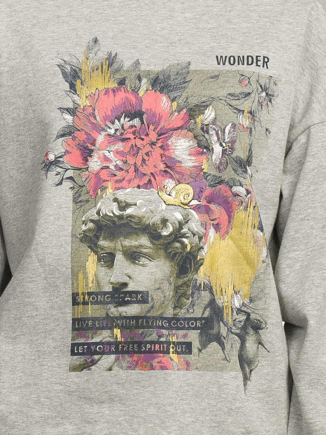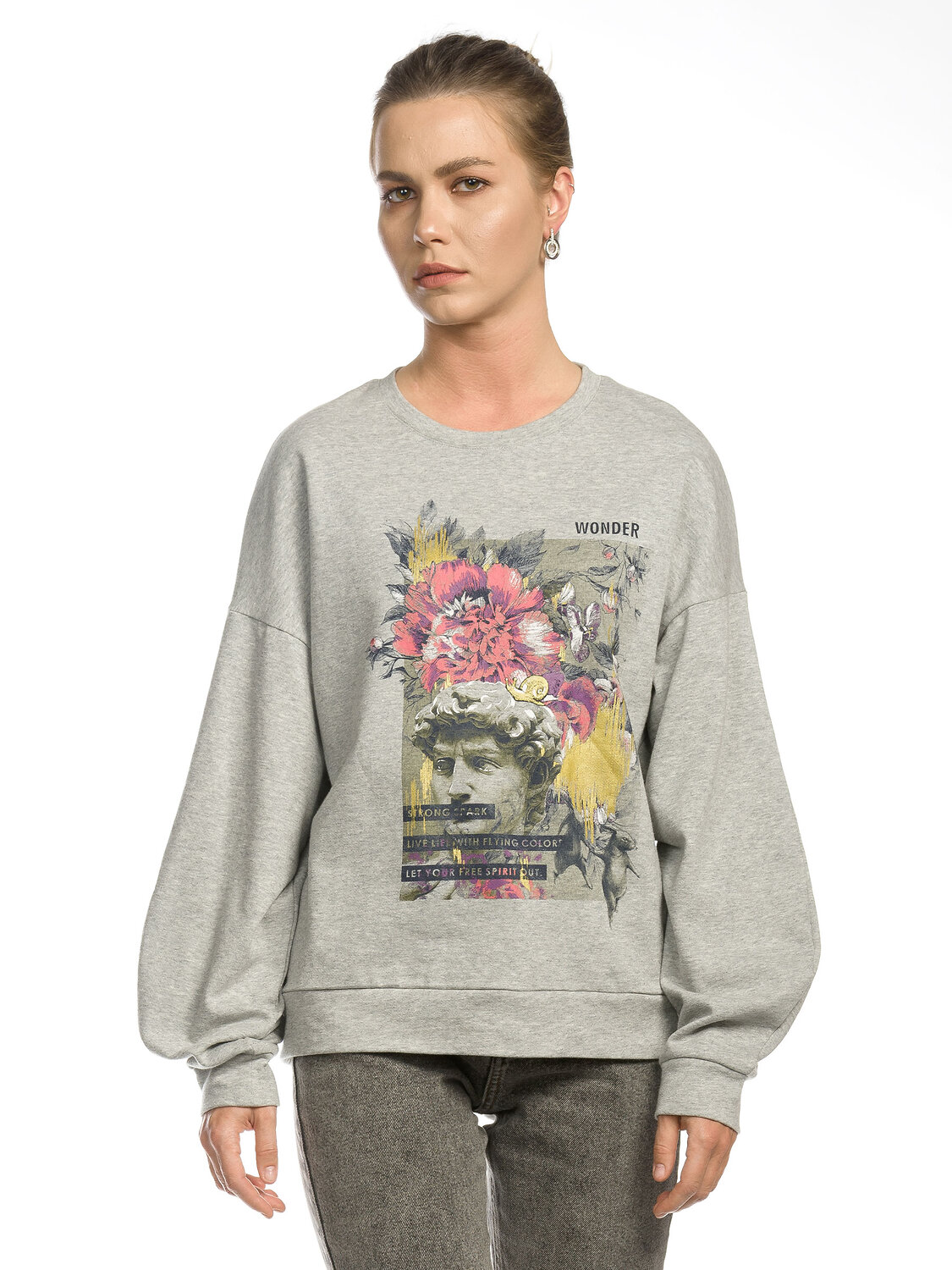 Толстовка женская. Новый по объему свитшот. Уникальный по форме рукав-лепесток. Низ изделия и манжеты - из основной ткани. Спущенная линия плеча. Мягкий стойкий soft-принт с золотой патиной. Перевод: "Чудо. Сильная душа. Проживай жизнь с триумфом. Выпусти свой вольный дух".