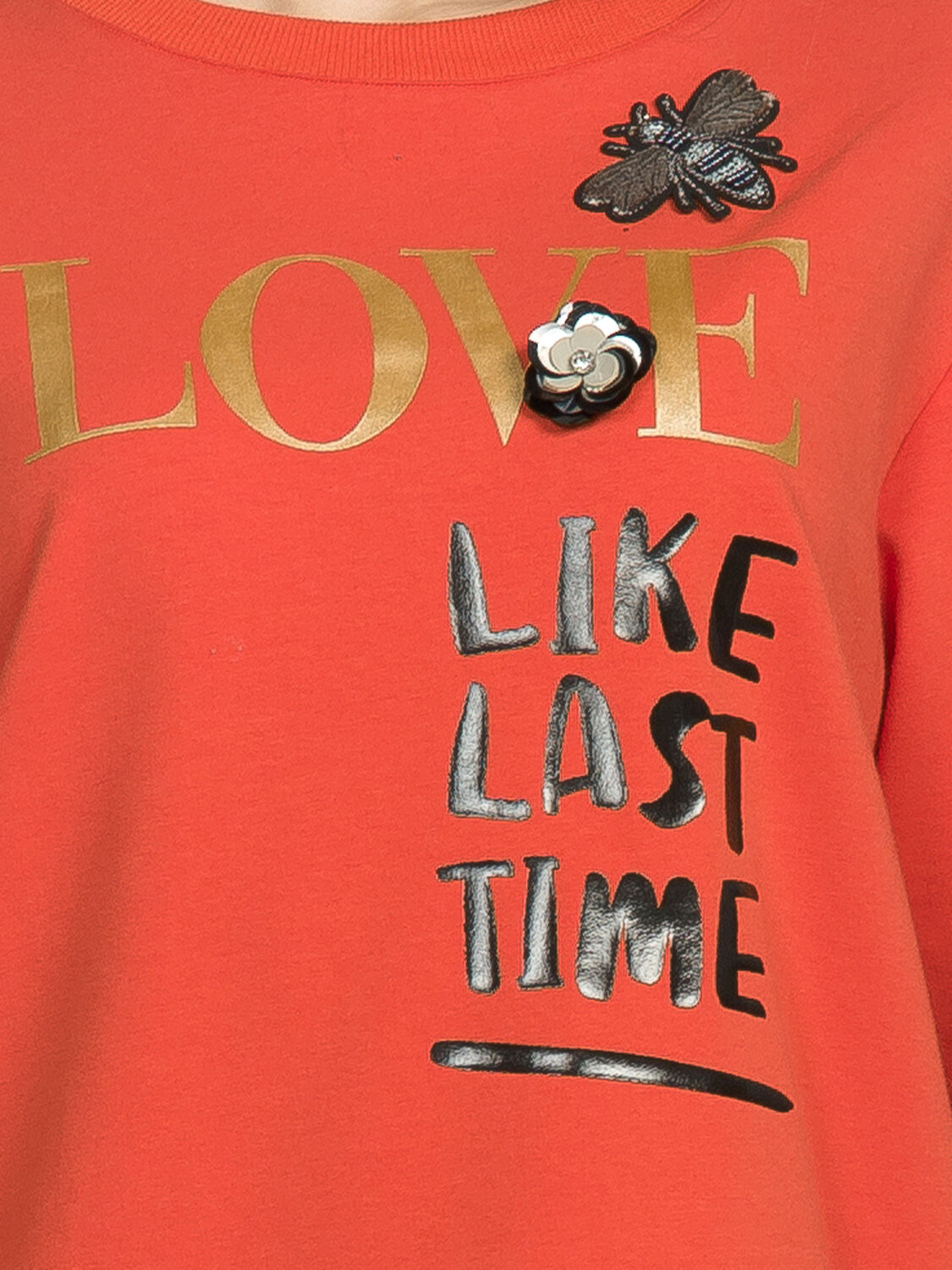 Толстовка женская. Увеличенный объем. Горловина и манжеты из рибаны. НОВИНКА в декоре: объемные нашивки - 3D-цветок из пайеток с крупным камнем и фактурная пчела со стразами и бисером - надежно пришиты к основе. Не линяют при стирке. Шрифт выполнен золотом и черным глянцем. Перевод: "Люби как последний раз".