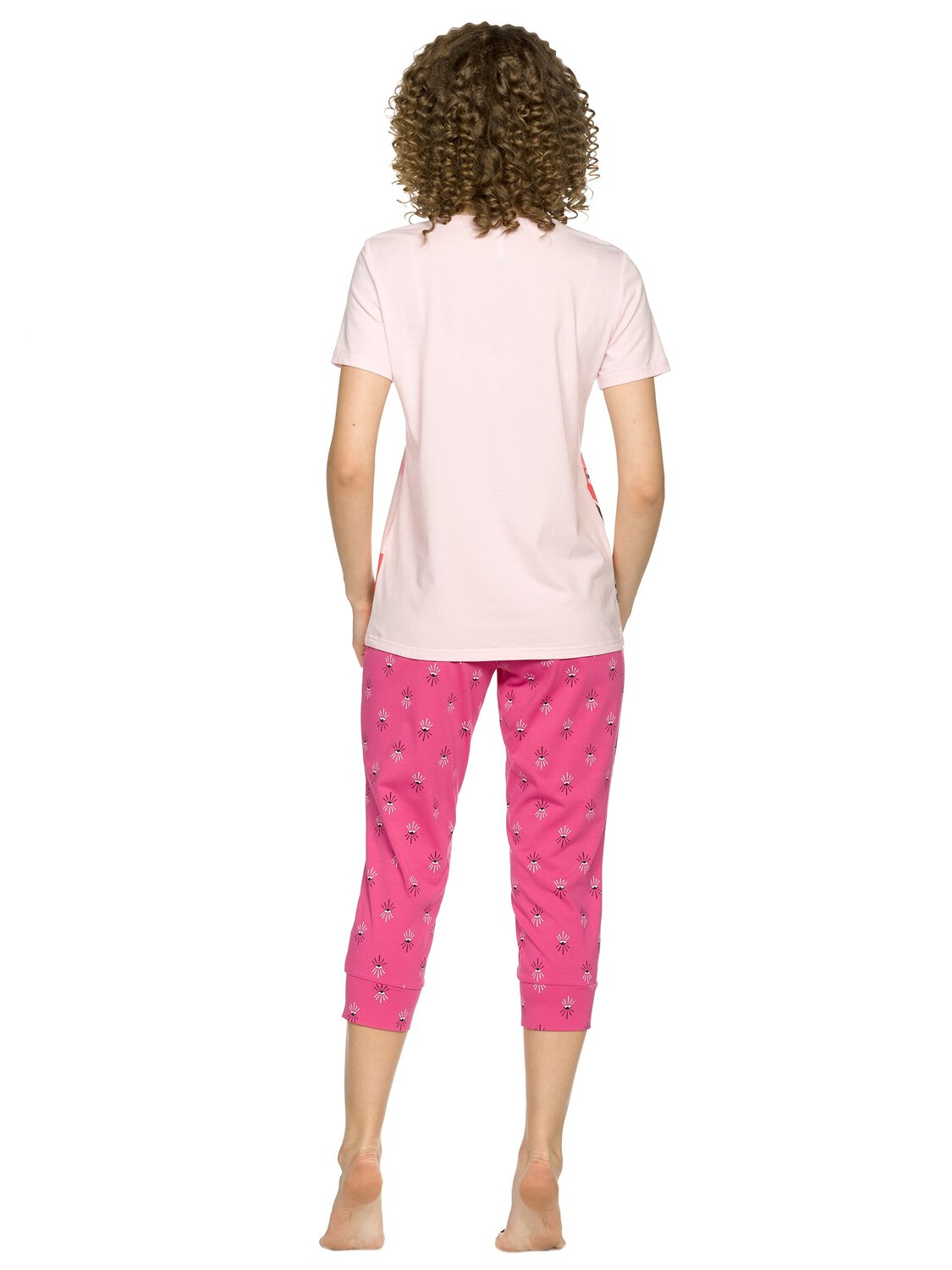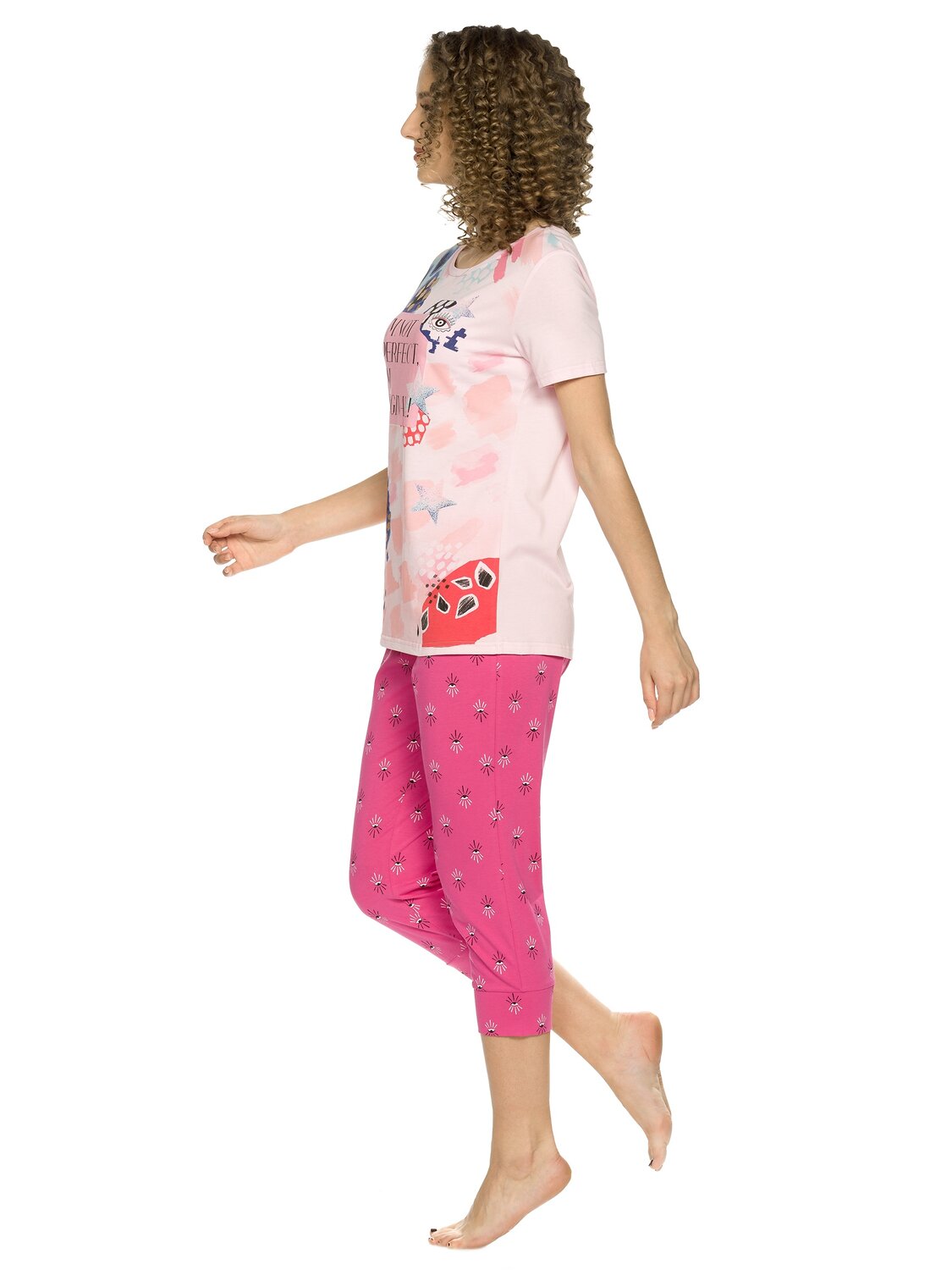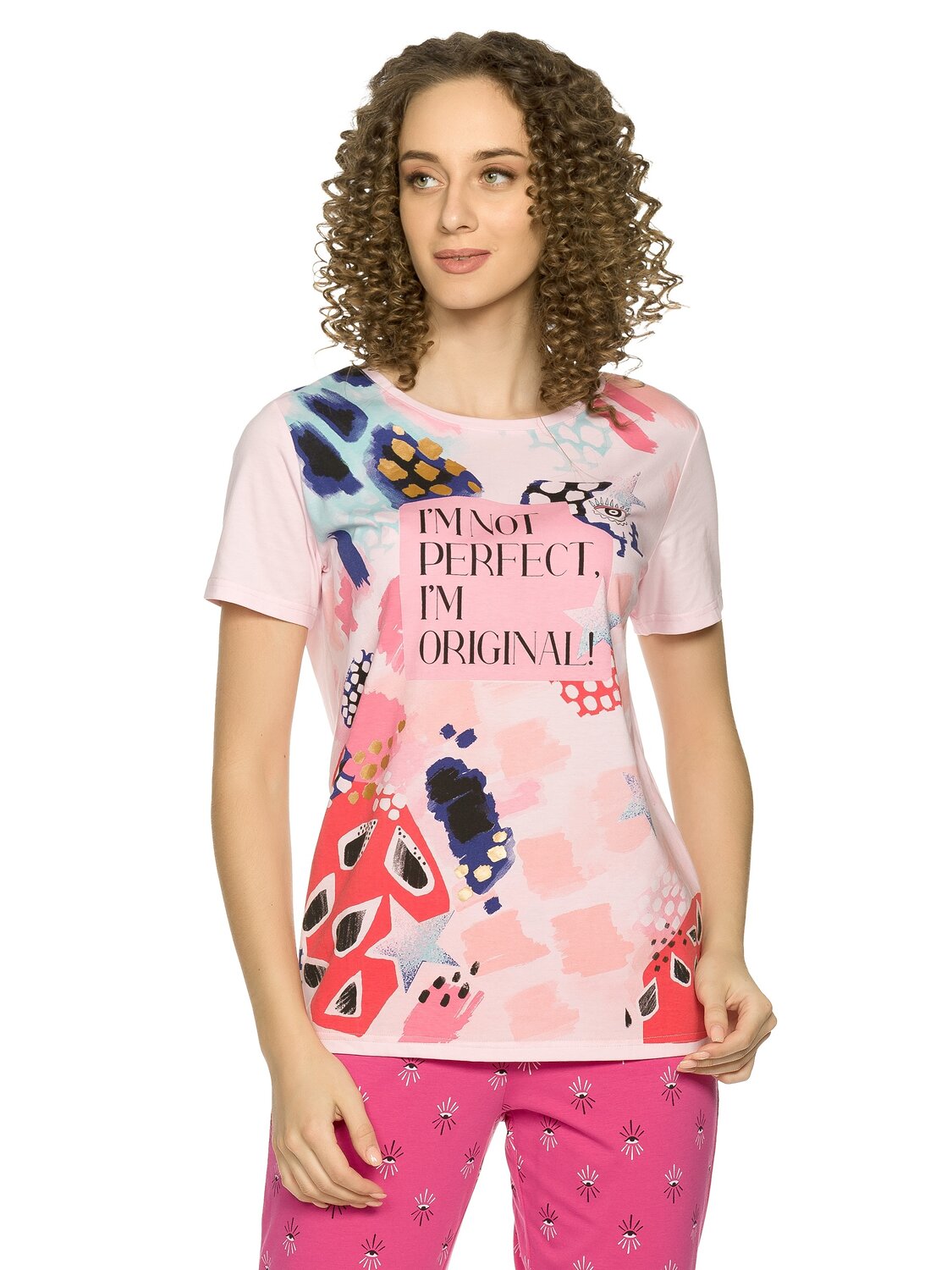 Комплект женский футболка и брюки. Футболка прямого кроя среднего объема. Мягкий стойкий принт с золотым металликом. Перевод Я не идеальная, я оригинальная.. Бриджи комфортного объема. По талии на плоской внутренней резинке, по низу манжеты шириной 7 см., all over принт.