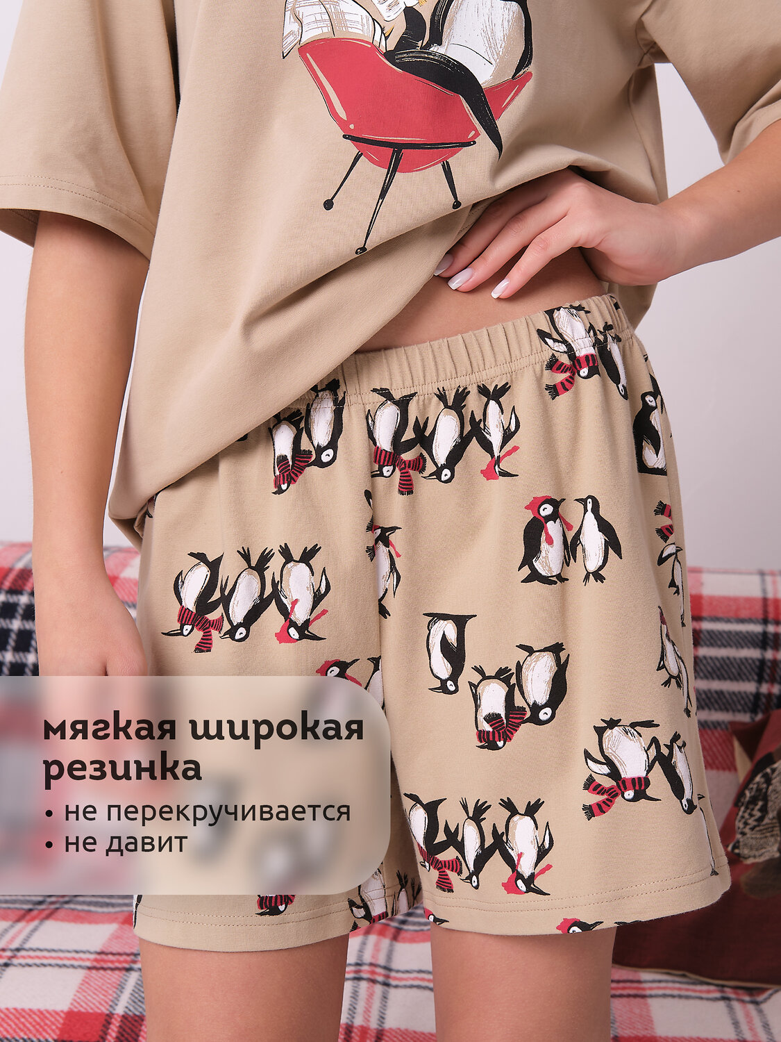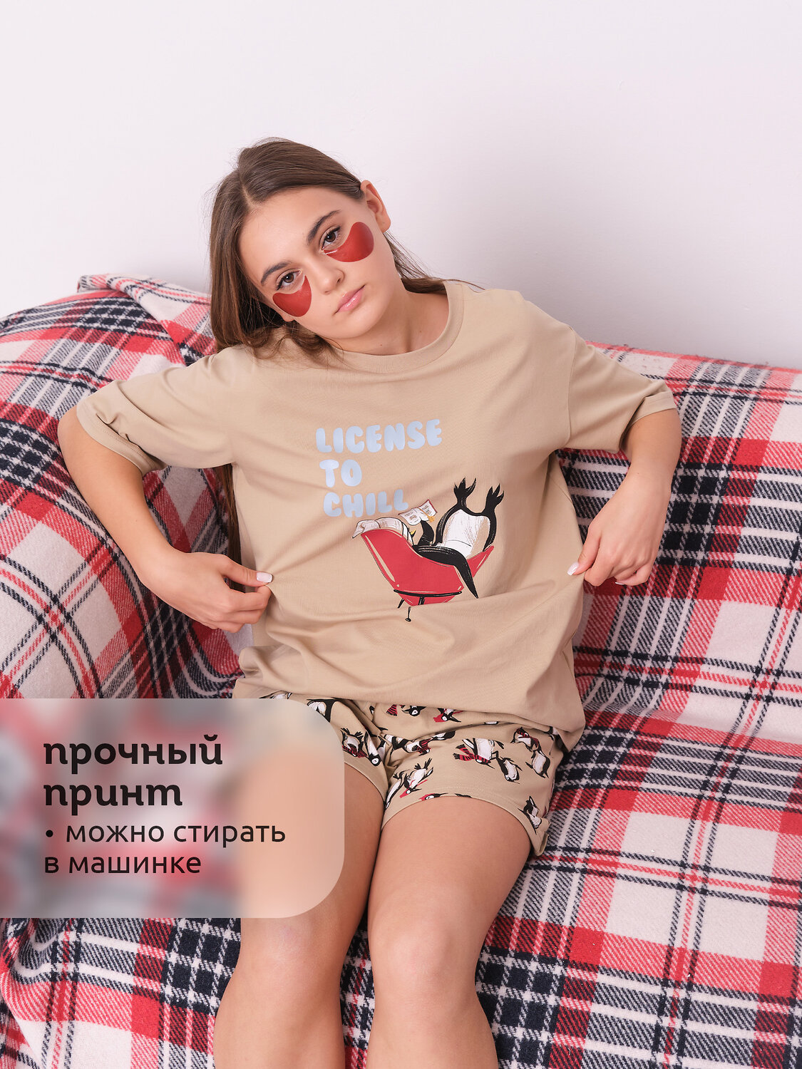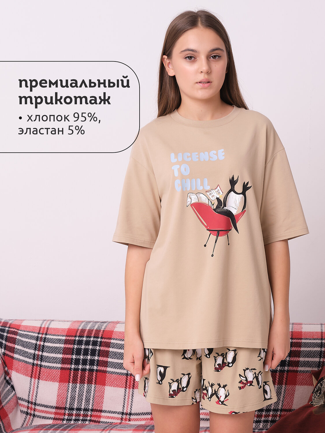Пижама женская с шортами. В составе ткани преобладает высококачественный хлопок — домашняя пижама мягкая, гипоаллергенная и хорошо пропускает воздух. В пижаме вам будет комфортно и уютно во время сна. Эластан помогает модели надолго сохранить первоначальную форму. Футболка свободная, плечо спущено, рукава широкие — в пижаме очень удобно спать. В поясе шорт мягкая и широкая резинка — не перекручивается и не давит. Отделка горловины из эластичной рибаны — она не растягивается, пижаму удобно надевать и снимать. Костюм домашний женский украшен прикольным принтом, надпись переводится: «лецензия на чилл» — поймайте позитивное настроение! Домашний комплект с шортами неприхотлив в уходе. Принты эластичные и прочные, без проблем переносит частые стирки. Помните о правильном уходе за изделием: рекомендуется стирать при температуре не выше 30 °C, без предварительного замачивания, с изнанки. Это поможет сохранить качество и цвет пижамы на длительное время. Не забывайте о выборе правильного размера. Используйте таблицу размеров на фотографии, чтобы выбрать подходящий для себя вариант. Обратите внимание, что цвет товара на экране вашего устройства может отличаться от реального.