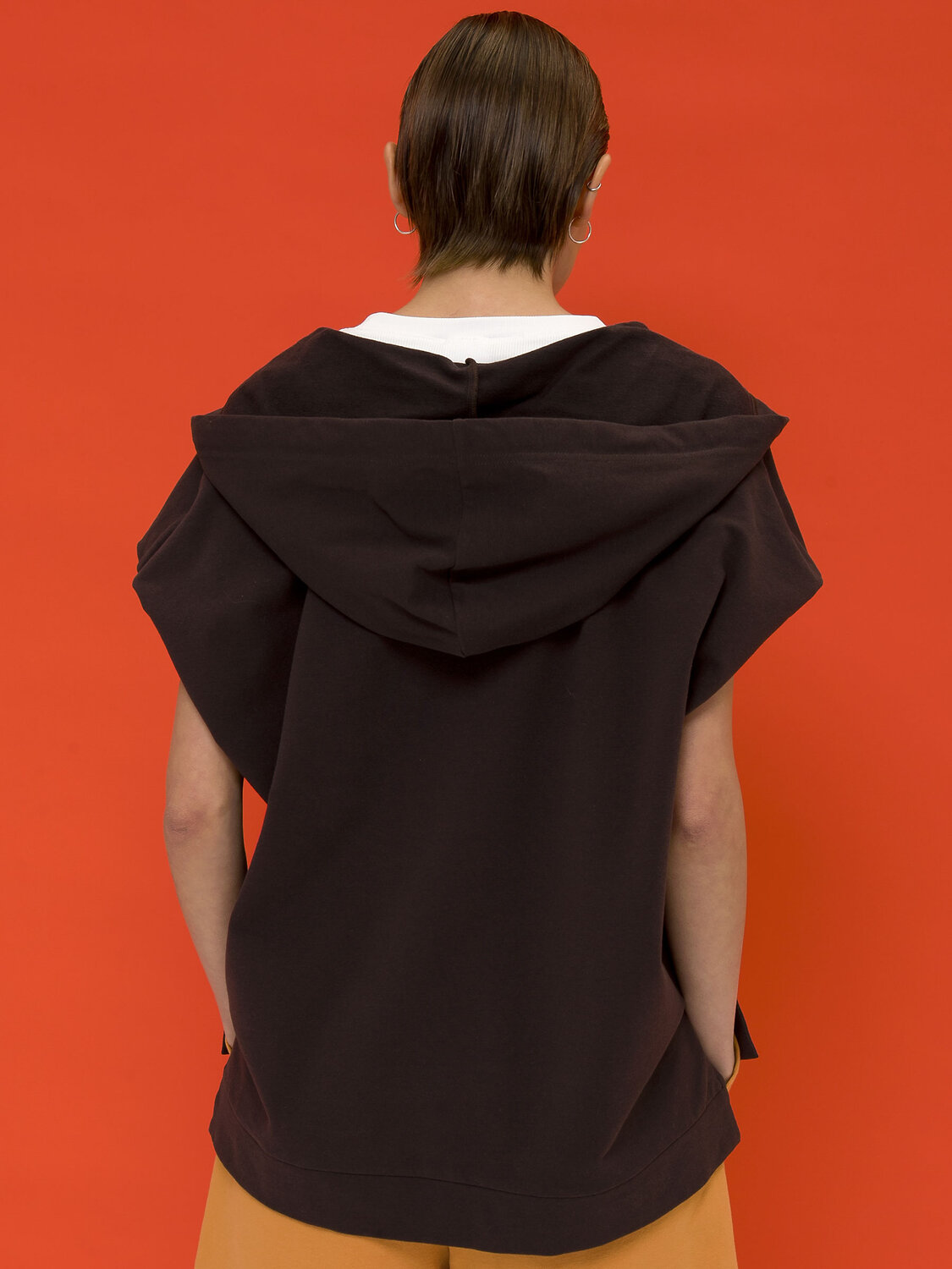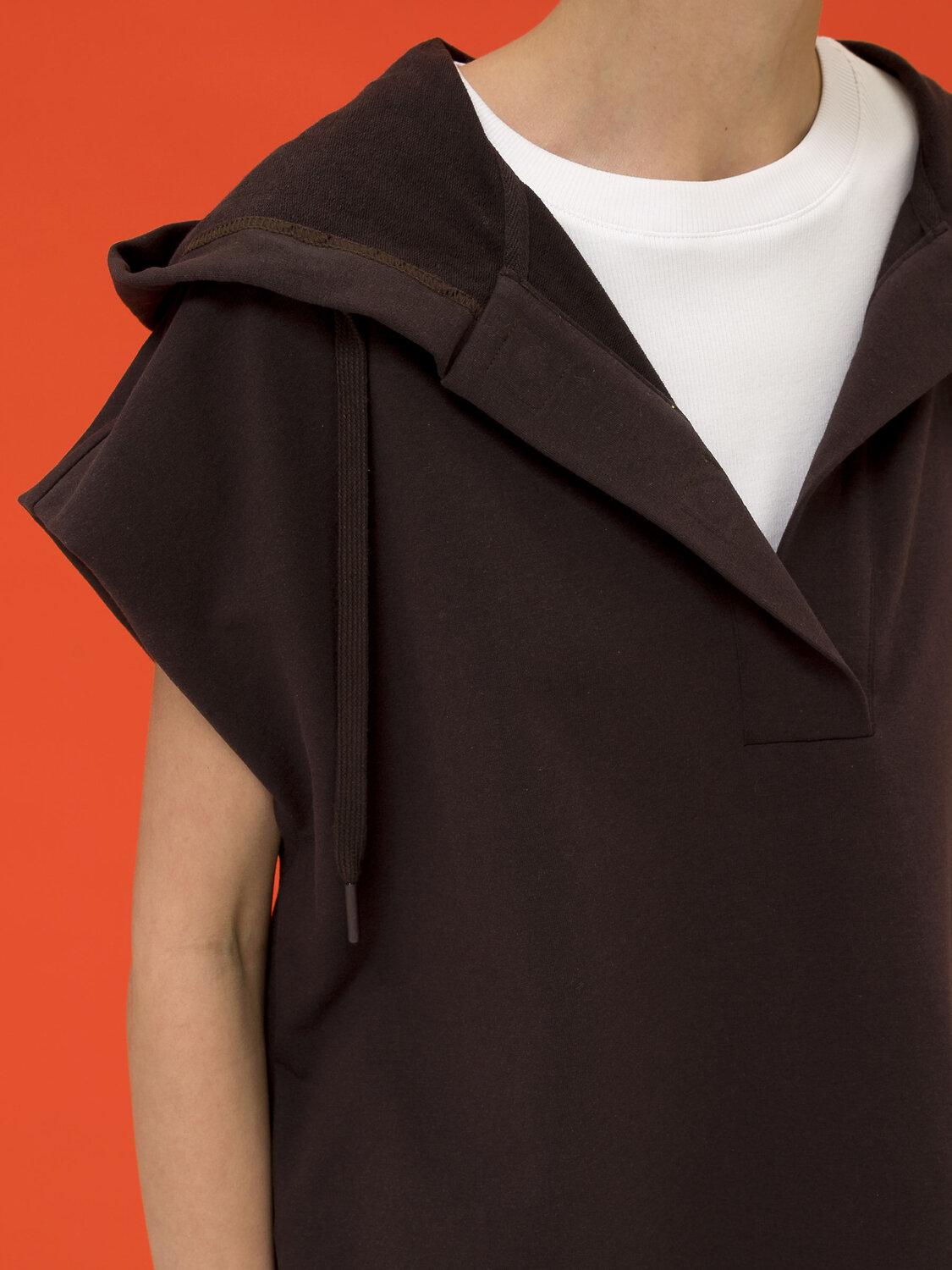 Жилет из футера для женщин. В составе ткани 96% хлопка — модель мягкая и приятная на ощупь. Благодаря эластану изделие сохраняет форму. Высокие разрезы по бокам обеспечивают комфорт в носке. По проймам со стороны плеча широкая подгибка, которая закреплена в плечевом и боковом швах. Она создаёт актуальную форму, капюшон при необходимости утягивается шнуром. Изюминка модели — широкая планка с оригинальной застёжкой на магниты. С таким жилетом вы сможете создать стильные многослойные образы. Подходит для разных типов фигуры.