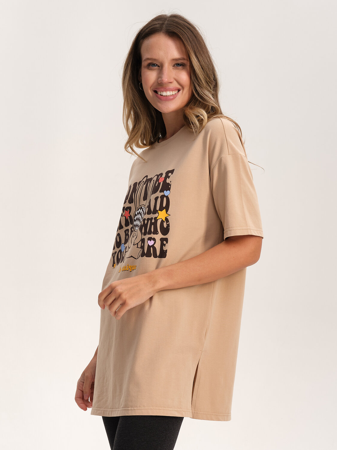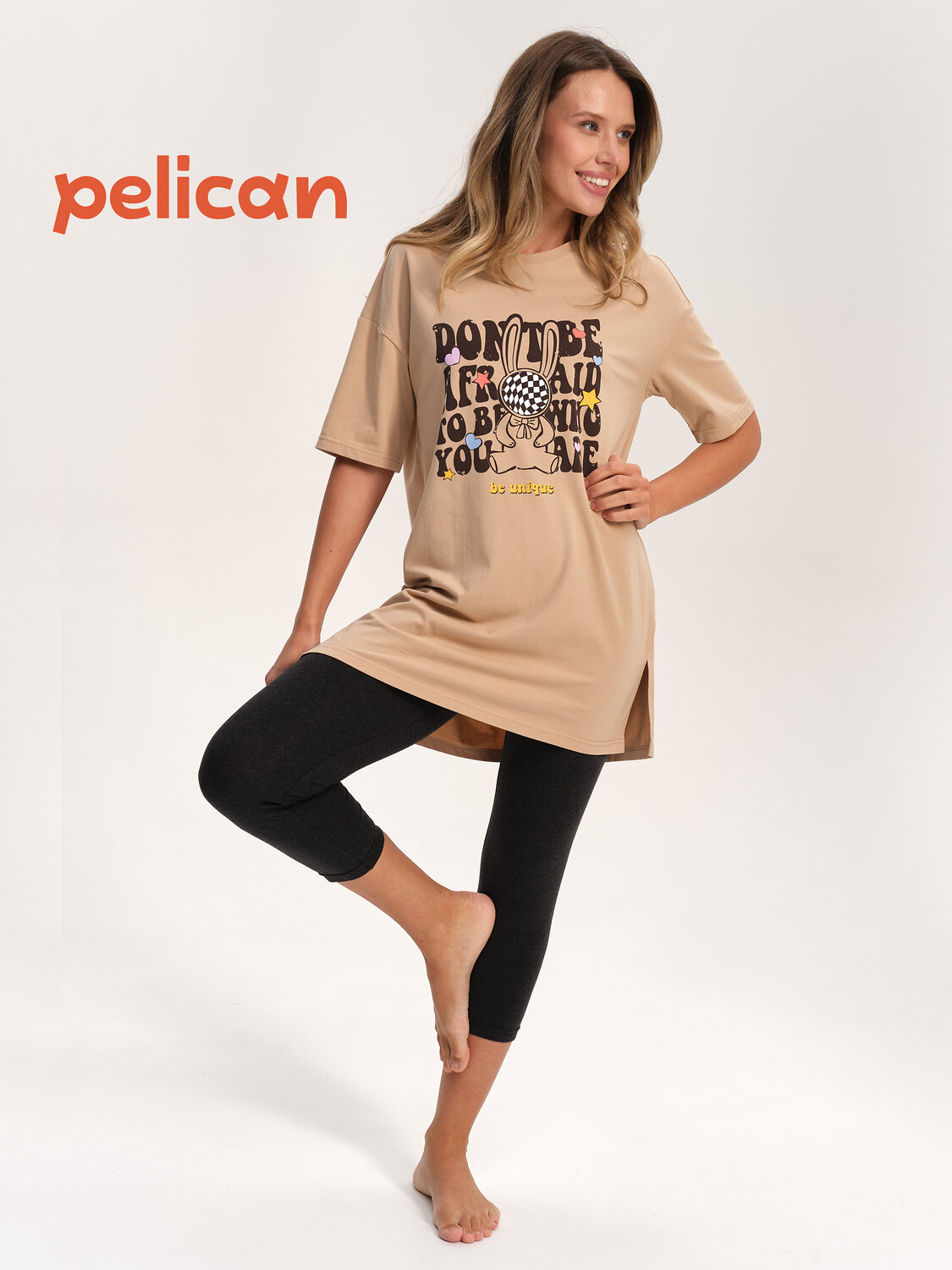 Пижама с леггинсами женская. В составе ткани преобладает высококачественный хлопок — комплект для сна мягкий, гипоаллергенный и дышащиц. В хлопковой пижаме вам будет комфортно и уютно во время сна. Благодаря эластану изделие надолго сохранит первоначальную форму. Футболка удлинённая, силуэта оверсайз, плечо спущено, рукава широкие — в пижаме очень удобно спать. В поясе комфортных лосин длиной 7/8 мягкая и широкая резинка — не перекручивается и не давит. Отделка горловины из эластичной рибаны — она не растягивается, пижаму удобно надевать и снимать. Хлопковая пижама украшена милым, «няшным» принтом в виде забавного зайчика с позитивным настроением, надписи переводятся: «не бойся быть тем, кто ты есть», «ты уникален». Пижамный костюм неприхотлив в уходе. Принт эластичный и мягкий, легко переносит частые стирки. Милая пижама подходит как для сна, так и просто для дома и отдыха. Помните о правильном уходе за изделием: рекомендуется стирать при температуре не выше 30 °C, без предварительного замачивания, с изнанки. Это поможет сохранить качество и цвет пижамы на длительное время. Не забывайте о выборе правильного размера. Используйте таблицу размеров на фотографии, чтобы выбрать подходящий для себя вариант. Обратите внимание, что цвет товара на экране вашего устройства может отличаться от реального.