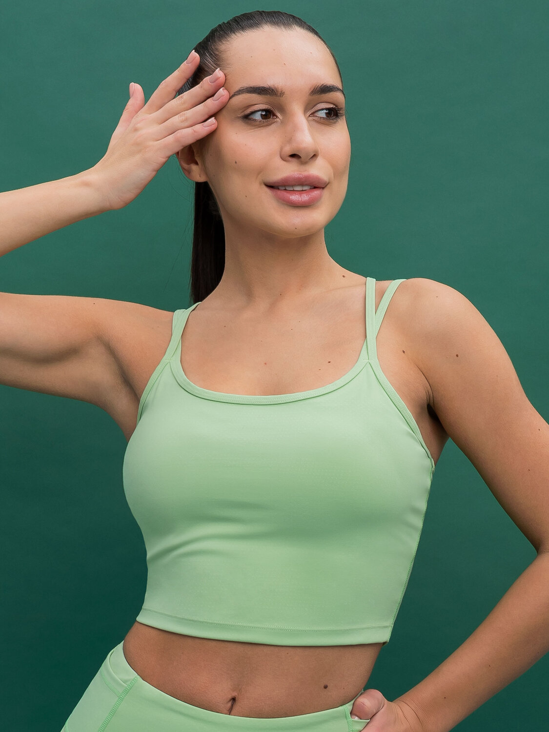 Базовая спортивная женская майка топ из эластичной ткани. Короткая майка с открытой спиной на тонких четырех бретелях, красиво перекрещивающихся на спине. Трендовые цвета и уникальные плоские швы. Женская спортивная майка для фитнеса и йоги сделает тренировки легкими, движения свободными, а занятия спортом в радость. Уникальные плоские швы не впиваются в кожу, не натирают при движениях, создавая приятное соприкосновение с телом. Долгие занятия йогой или активные занятия на тренажерах больше не принесут дискомфорта. Удобная майка для женщин подходит для тренировок и для занятий в тренажерном зале, пилатеса, для бега, для йоги и фитнеса, занятий танцами и прогулок. Укороченная майка, комфортная посадка красиво сядет по фигуре, подчеркнув природные линии тела. Топ с чашками надежно поддержит грудь даже при активных движениях. Топ без косточек. Приталенный силуэт и длина до талии надежно зафиксирует изделие на теле. Кроп топ с открытой спиной способствует воздухопроницаемости и дополнительному охлаждающему эффекту. Топик для девушек прочно вошел в современные образы, стирая грань повседневной и спортивной одежды. Модная майка для спорта - это не просто одежда для фитнеса, это базовая вещь в женском гардеробе. Можно надевать майку с чашками под пиджак, под рубашку, в качестве первого слоя под одежду. Маечка сочетается с джинсами, спортивными леггинсами, велосипедками. Подойдет как белье под объемный свитер с открытым плечом.