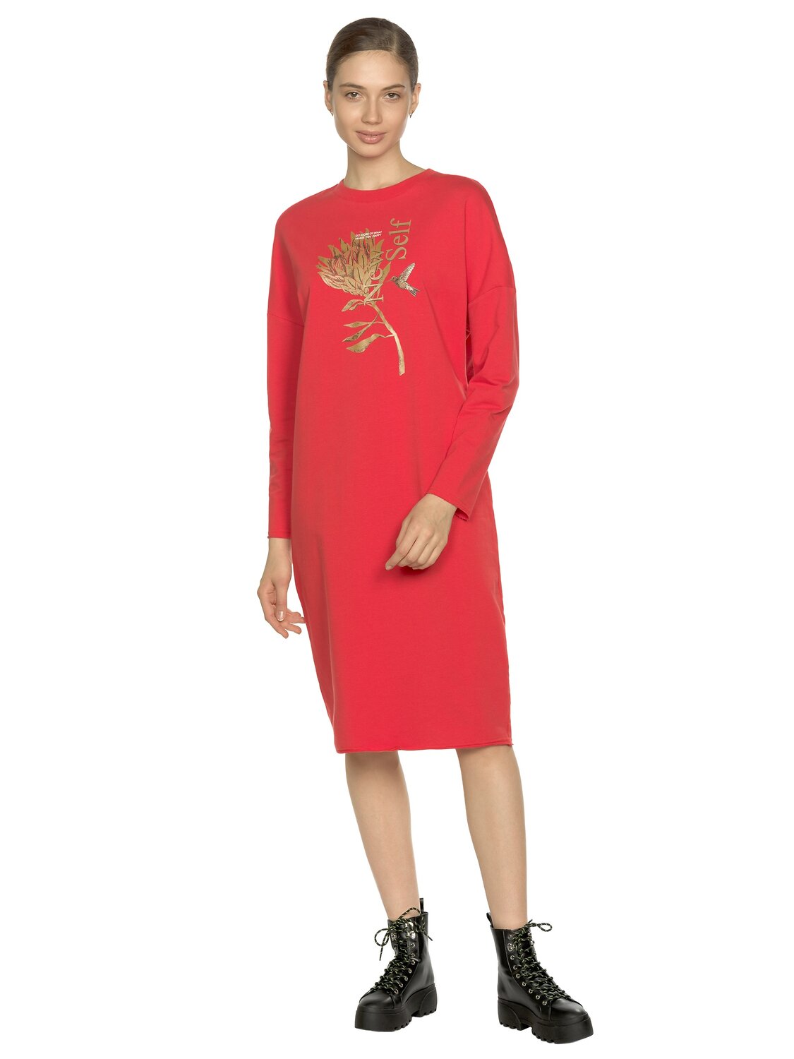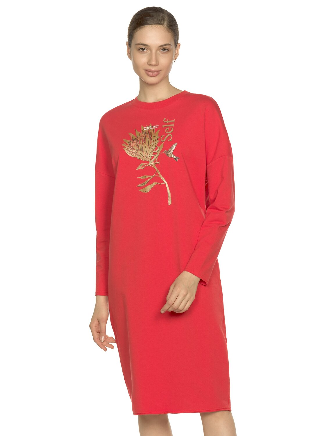 Платье женское из футера силуэта кокон с сильно опущенной линией плеча, горловиной из рибаны и устойчивым принтом из золота. По рукавам и низу изделия актуальный элемент street style открытый срез и декоративная строчка, которые придают легкость изделию. Перевод Делай больше того, что делает тебя счастливым. Новая я.