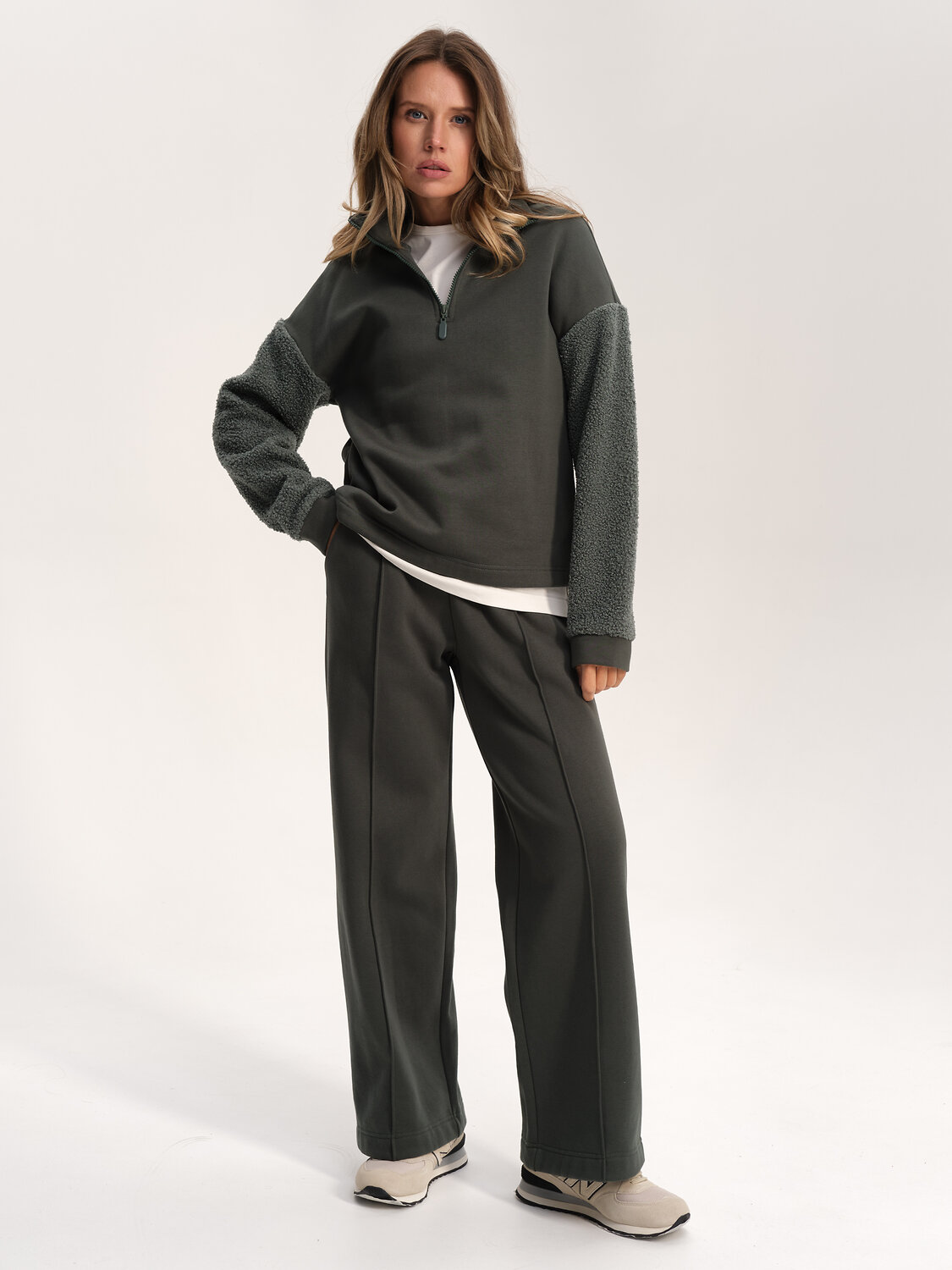 Стильный женский свитшот свободного силуэта со спущенным плечом. Толстовка без капюшона выполнена в комбинации двух материалов: гладкого футера и фактурного меха «барашек». Это актуальный модный тренд. Толстовка с воротником-стойкой. Он защитит от холода и ветра. Застёжка на короткую молнию — удобно и быстро застёгивать и расстёгивать. По низу удобная кулиска — можно регулировать объём и посадку. Свитшот однотонный, без принта. Изделие неприхотливо в уходе, его легко стирать, ткань быстро сохнет и не склонна к образованию катышков. В составе основной ткани (футкер с начесом) преобладает качественый хлопок — толстовка мягкая, отлично дышит. Рукава выполнены из мягкого и приятного на ощупь бербер-флиса (фактура «барашка»). Свитшот представлен в двух универсальных цветах: чёрном и молочном. Его легко сочетать с различными моделями брюк. Размерная линейка: XS (42): S (44): M (46): L (48). Толстовка идеальна как для женщин, так и для девушек и девочек-подростков. Подходит и высоким, и невысоким девушкам. Оверсайз-свитшот — прекрасный выбор для повседневной носки и активного отдыха. Он тёплый, лёгкий и мягкий. Для круглогодичного применения: прохладным летом, осенью, зимой, весной и демисезон. Это модный и практичный подарок для сестры, подруги или дочки на любой праздник.