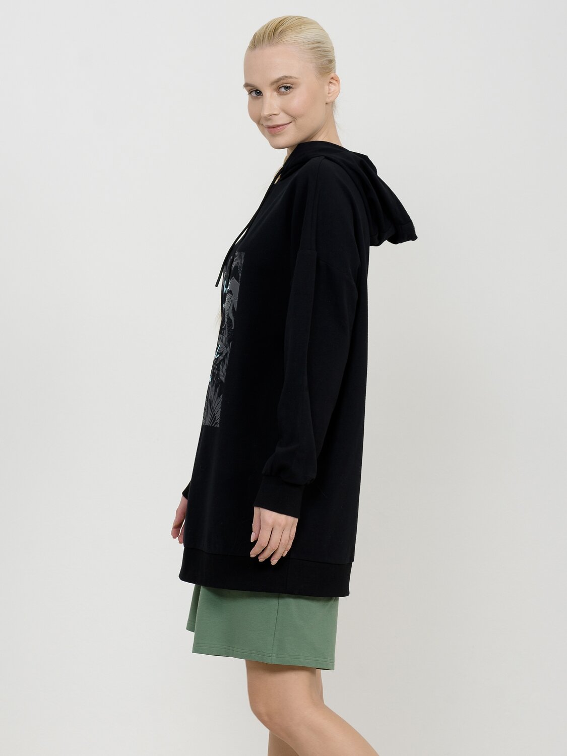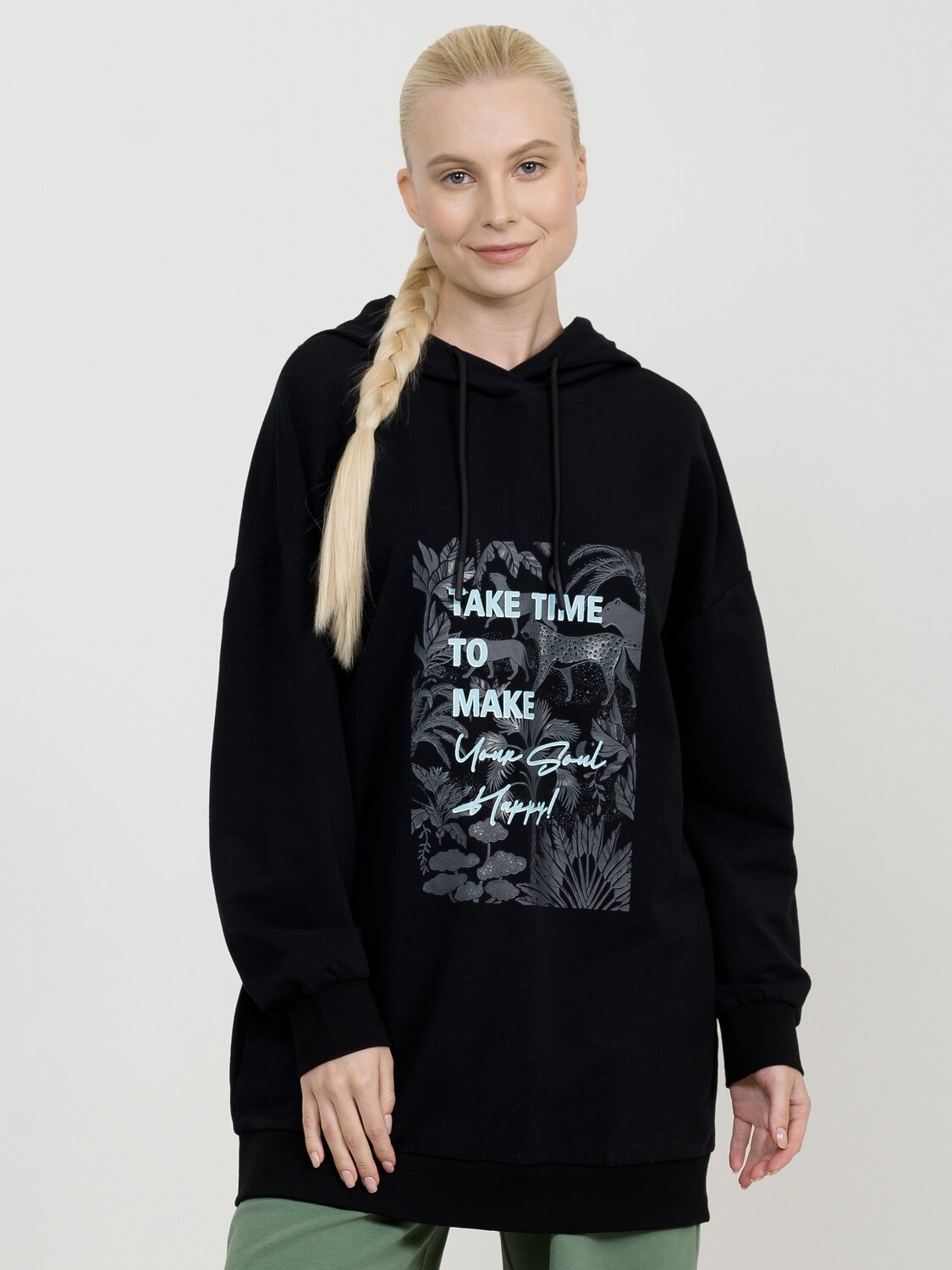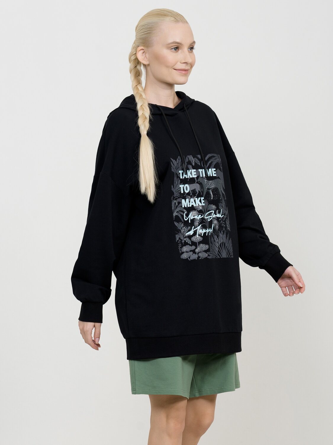 Удлиненное худи большого объема с эластичным принтом с глянцем. Манжеты по низу рукава и низу изделия из рибаны. Объем капюшона регулируется шнурком черного цвета. Перевод Найдите время, чтобы сделать свою душу счастливой.