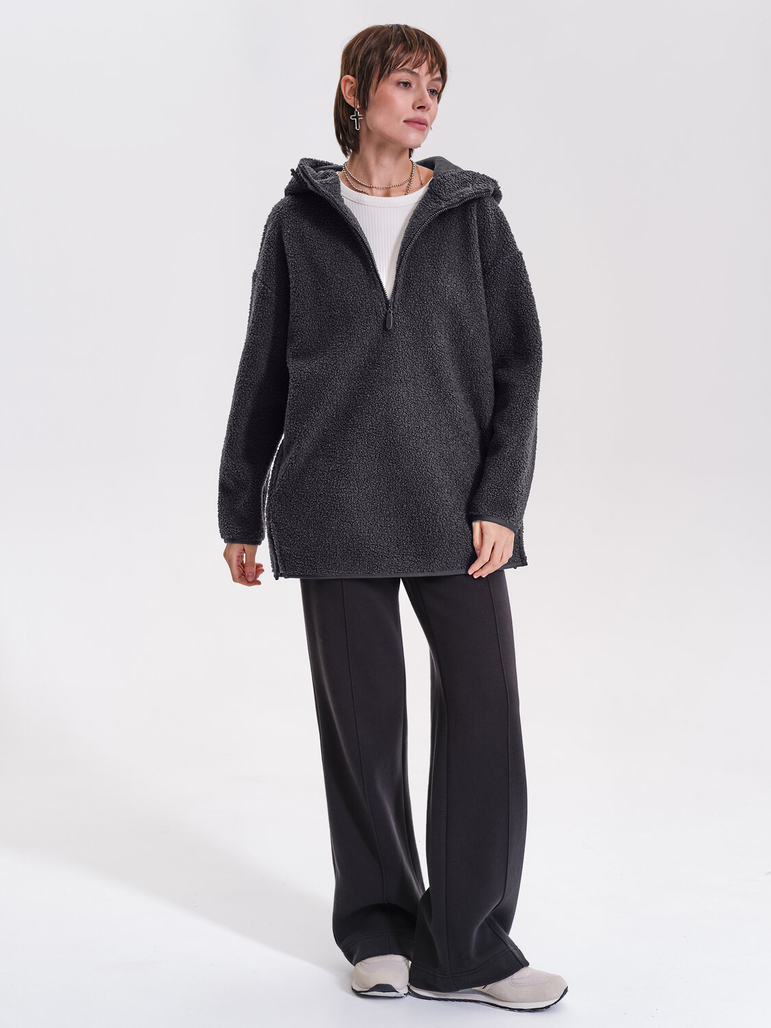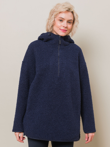 Худи женское – удобная и практичная одежда из новой коллекции бренда Pelican. Пушистая толстовка с капюшоном, кулиской и молнией по горловине до середины груди универсальна. Ее можно надеть под верхнюю одежду, она не будет стеснять движений. Легко комбинировать с другими моделями из зимней коллекции. Шнурки с карабинами - для фиксации нужной длины. Изделие с карманами. Худи с капюшоном отлично будет сочетаться как с футболкой, так и джемпером с воротником-стойкой из коллекции. Толстовка женская на молнии с капюшоном не требует особого ухода. Материал изделия (бербер-флис) после стирки не растягивается, не линяет. Быстро сохнет, что очень удобно в поездках за город на каникулы с детьми и семьей. На рукавах и по низу худи – оригинальный кант из ткани в тон основного материала. Эта кофта с замком по горловине точно станет любимой вещью вашего гардероба. Толстовка женская будет защищать от ветра и непогоды и отлично сочетается с брюками, треггинсами из теплой ткани, курткой или пальто. Новые модели выполнены в приятной палитре - сине-серого цвета (полуночный синий) и молочного. Модная флисовая кофта женская точно понравится любой девушке, девочке-подростку и женщине. Худи оверсайз не сковывает движений при занятиях зимним спортом. Такую вещь также можно подарить на Новый год или Рождество в качестве заботливого подарка, устроить фотосессию в стиле сканди. Только представьте, как уютно можно укутаться в теплый и мягкий флис зимним вечером или утеплиться на снежную прогулку с семьей.