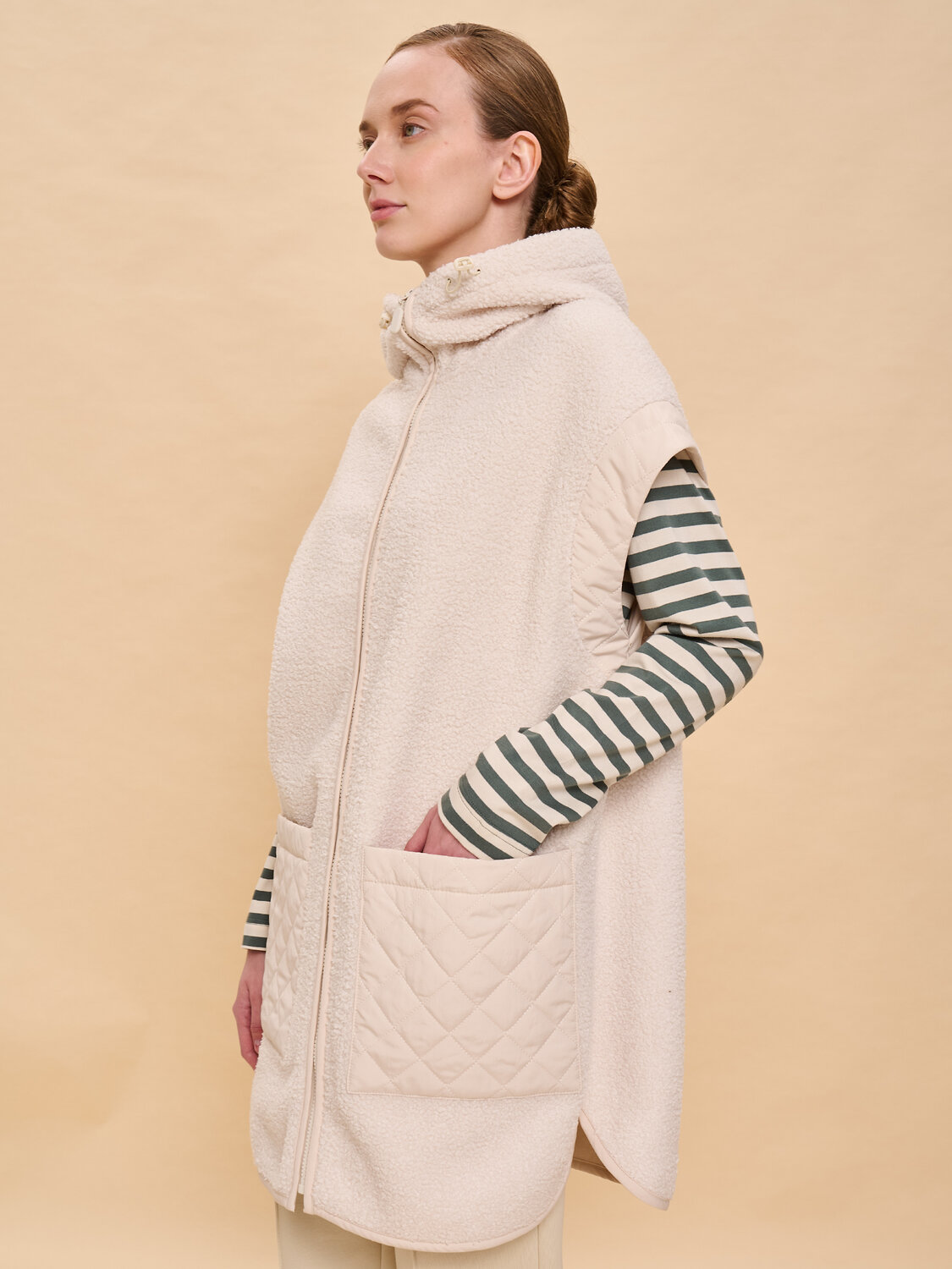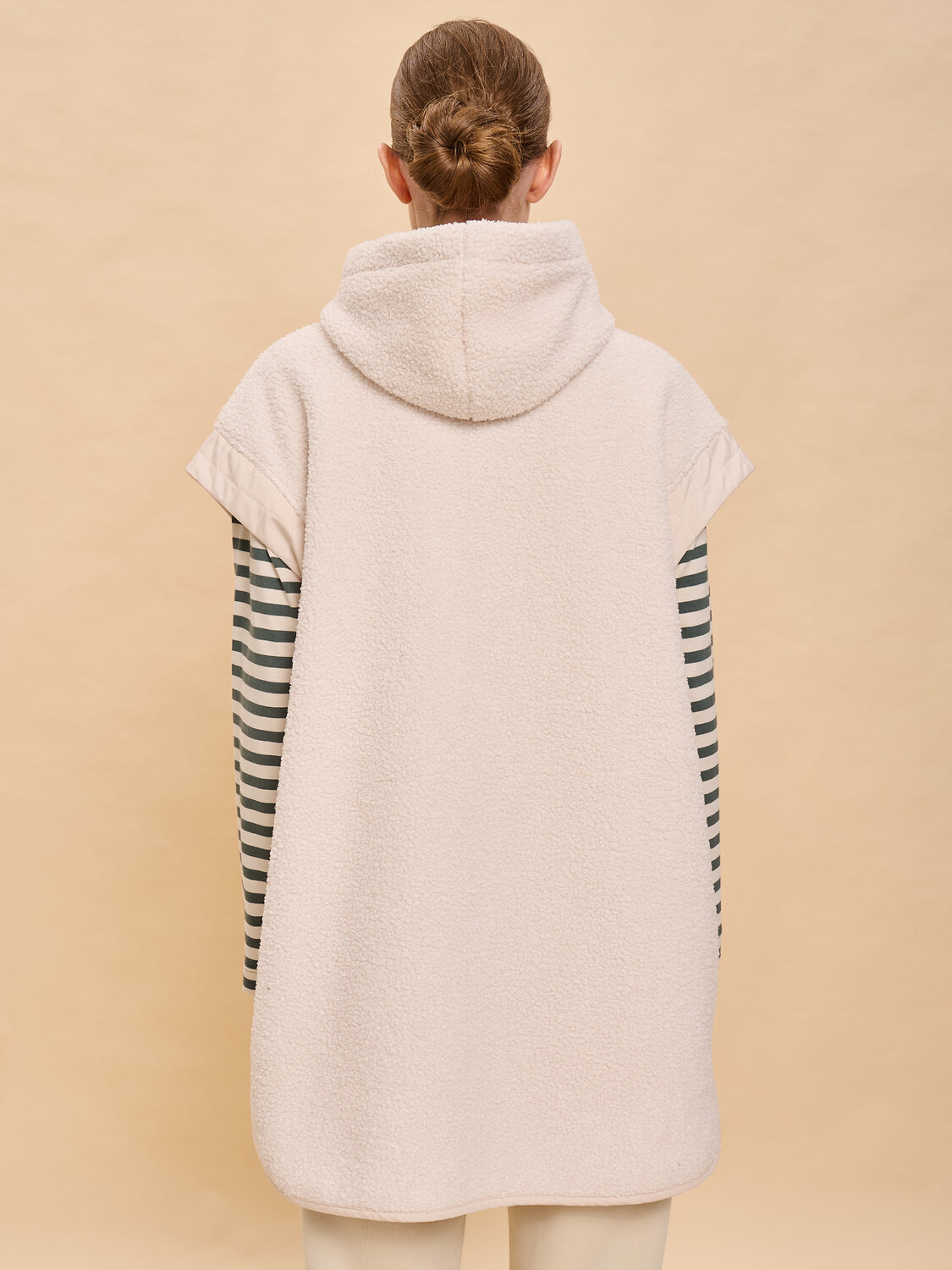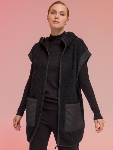 Женский жилет из модного бербер-флиса (мягкая фактура «барашка»). Жилет оверсайз-силуэта со спущенным плечом подарит вам комфорт и свободу движения. Высокий воротник-стойка и удобный капюшон защитят от холода и ветра. Объём капюшона можно регулировать внутренним эластиком со стопперами. Изделие дополнено накладными карманами, отстроченными в крупную клетку — актуально в этом сезоне. Застёжка на длинную молнию по переду. Карманы и отделка пройм и молнии выполнены из гладкого «курточного» материала — сочетание тканей разных фактур — актуальный модный тренд. Безрукавка однотонная, без принта. За ней легко ухаживать. Изделия из качественного флиса прочные, легко стираются, не линяют, быстро сохнут и устойчивы к образованию катышков. Флисовый жилет очень лёгкий, тёплый и прекрасно пропускает воздух. Модель выполнена в двух базовых цветах: чёрный жилет и серый. В линейке представлены следующие размеры: S-M (44-46): L-XL (48-50). Жилетка оверсайз подходит как женщинам, так и девушкам с разными типами фигуры. Безрукавка идеальна для прогулок, активного отдыха. Её можно надеть на толстовку — получится прекрасная альтернатива верхней одежде для ранней осени. Жилет подходит для демисезона (осень и весна) и прохладного лета. Это замечательный подарок маме, сестре или подруге на любой праздник.