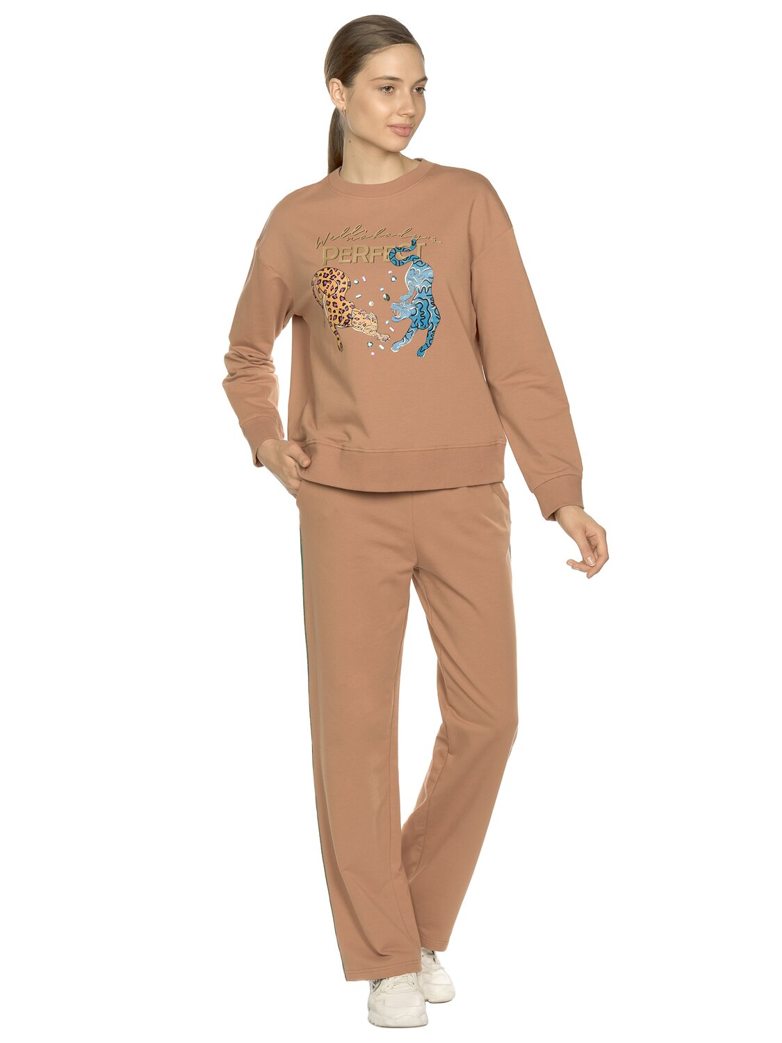 Комплект женский свитшот и брюки. Свободный расслабленный объем. Укорочённый свитшот со стильными широкими манжетами из рибаны. Суперстойкий центральный моно принт с добавлением золота и цветных термостраз. Шрифтовой rubber принт выполнен золотым металликом. Перевод Что ж, никто не совершенен. Прямые свободные брюки с контрастными трикотажными лампасами с люрексом. Карманы в боковых швах.