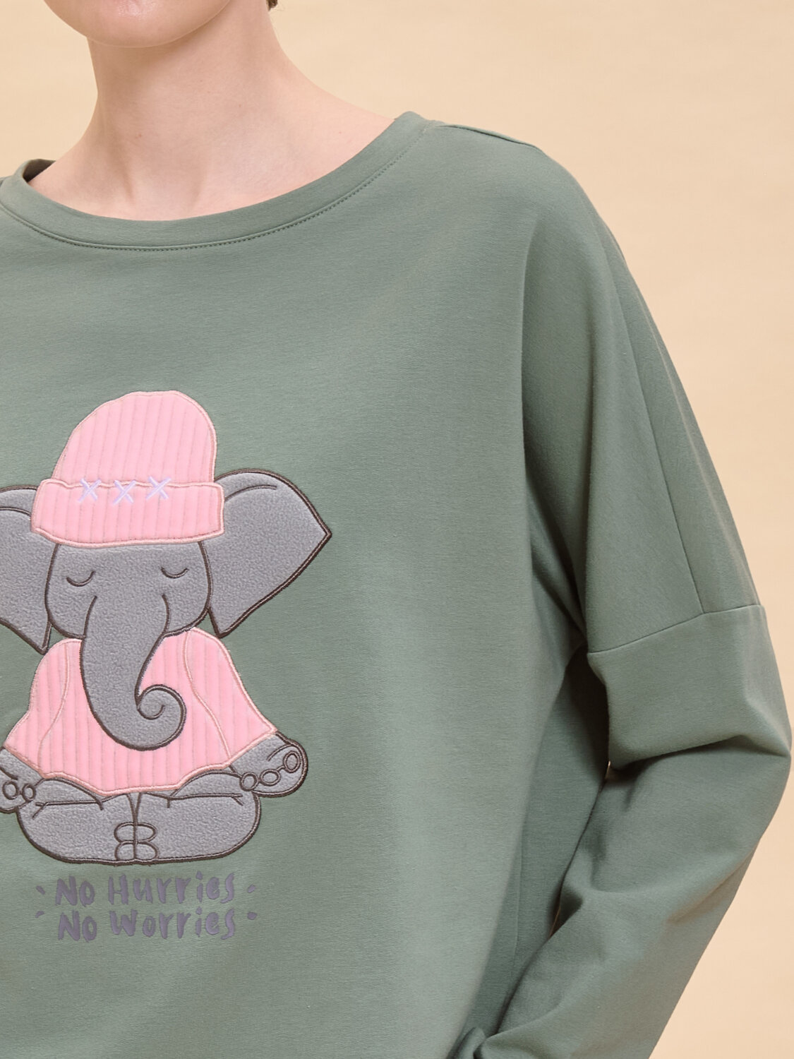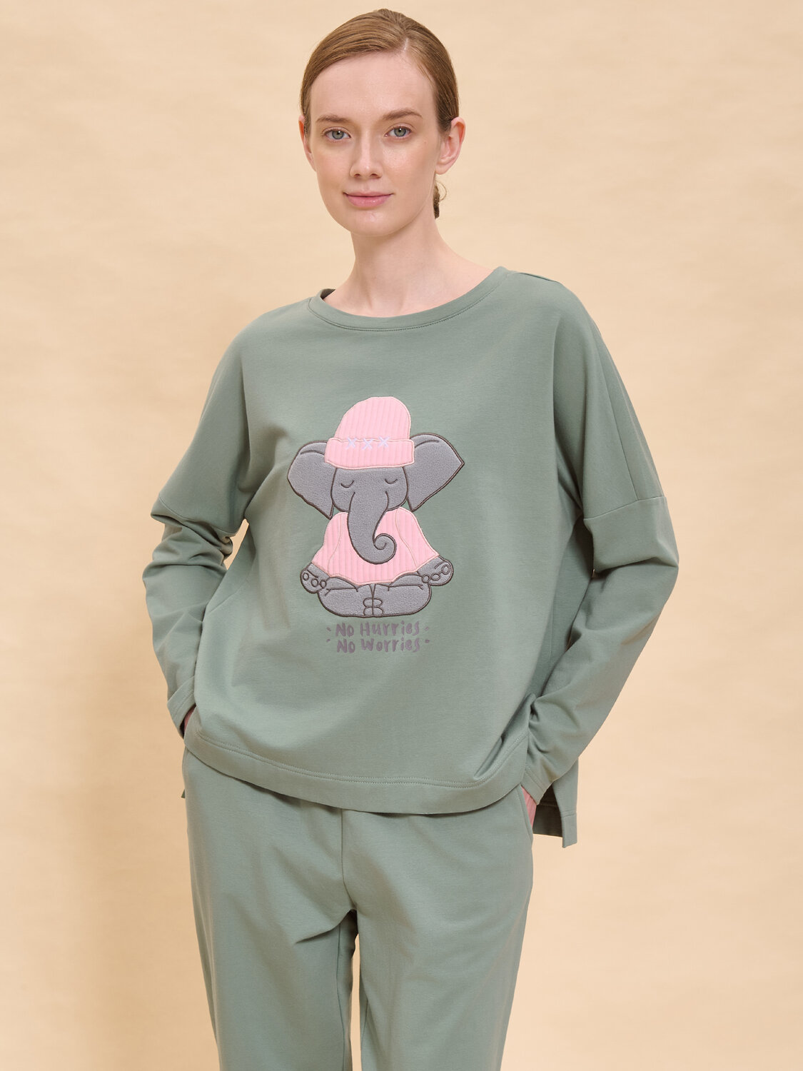 Теплая пижама женская. В составе ткани (футер с начёсом) преобладает высококачественный хлопок — комплект для сна мягкий, гипоаллергенный и хорошо пропускает воздух. В хлопковой пижаме вам будет тепло и уютно во время сна. Эластан помогает модели надолго сохранить первоначальную форму. Джемпер и брюки умеренного объёма, плечо джемпера спущено, спинка чуть длиннее переда— в пижаме очень удобно спать. В поясе брюк мягкая и широкая резинка — не перекручивается и не давит. Отделка горловины из эластичной рибаны — она не растягивается, пижаму удобно надевать и снимать. Хлопковая пижама украшена милым, «няшным» принтом в виде медитирующего слоника, надписи переводятся: «никакой спешки», «не беспокойтесь» — почувствуйте себя уютно и беззаботно. Шляпка и майка слоника — аппликация из тактильного приятного бербер-флиса с нежной фактурой барашка. Пижамный костюм неприхотлив в уходе. Принт эластичный и мягкий, хорошо переносит частые стирки. Пижама женская с брюками подходит как для сна, так и просто для отдыха дома. Помните о правильном уходе за изделием: рекомендуется стирать при температуре не выше 30 °C, без предварительного замачивания, с изнанки. Это поможет сохранить качество и цвет пижамы на длительное время. Не забывайте о выборе правильного размера. Используйте таблицу размеров на фотографии, чтобы выбрать подходящий для себя вариант. Обратите внимание, что цвет товара на экране вашего устройства может отличаться от реального.