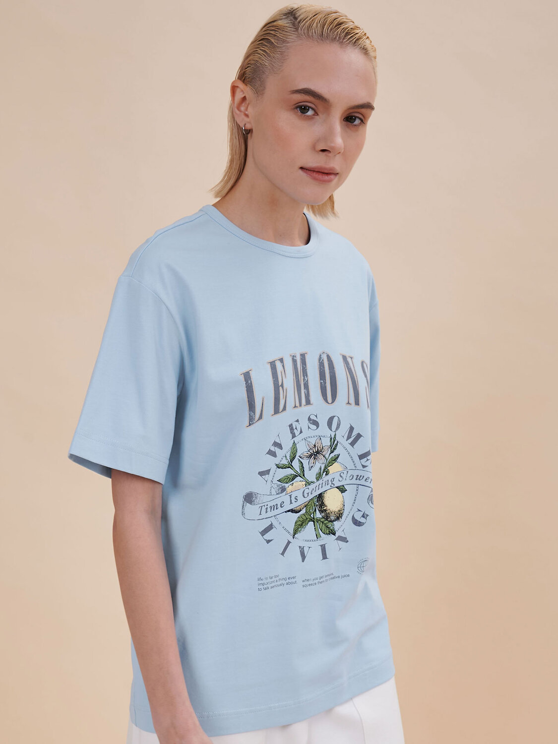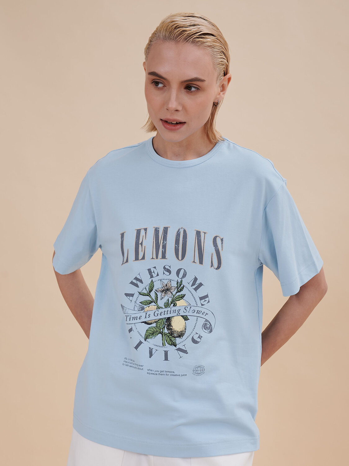 Женская футболка с принтом. Стильная и удобная футболка среднего объема со спущенным плечом подарит вам комфорт и свободу движения. Джемпер такого силуэта скрывает недостатки фигуры и подчёркивает достоинства. Майка с прямыми рукавами идеальна для повседневной носки. Она неприхотлива в уходе. Трикотажная футболка украшена трендовым принтом в духе садоводческих клубов по переду. Надписи переводятся: "лимоны", "потрясающее времяпрепровождение", "время идёт медленнее", "жизнь — слишком серьёзная штука, чтобы говорить о ней всерьёз", "когда вы возьмёте лимоны, выжмите из них творческие соки", "жизнь хороша", "просто добавь воды". Принт качественный и стойкий — без проблем переносит многочисленные стирки. В составе ткани преобладает высококачественный хлопок — футболка мягкая, приятная на ощупь и позволяет коже дышать. Эластан помогает изделию надолго сохранить первозданную форму. Джемпер представлен в следующих актуальных цветах: чёрный, голубой, синий, жёлтый, кремовый, зелёный, белый. Размерная линейка: XS (42): S (44): M (46): L (48): XL (50). Идеально и для женщин, и для девушек, и для девочек-подростков. Базовая футболка среднего объёма универсальна, отлично подходит для работы, учёбы, спорта, прогулок, отдыха, а также для дома и сна. Хлопковая футболка легко сочетается с различными брюками, юбками и шортами. Её можно носить летом, зимой и в демисезон (осенью и весной). Модная футболка — это прекрасный подарок сестре, подруге или маме на любой праздник. Выбирайте нужный размер по таблице размеров на фото. Цвет товара на экране вашего устройства может отличаться от цвета изделия вживую.
