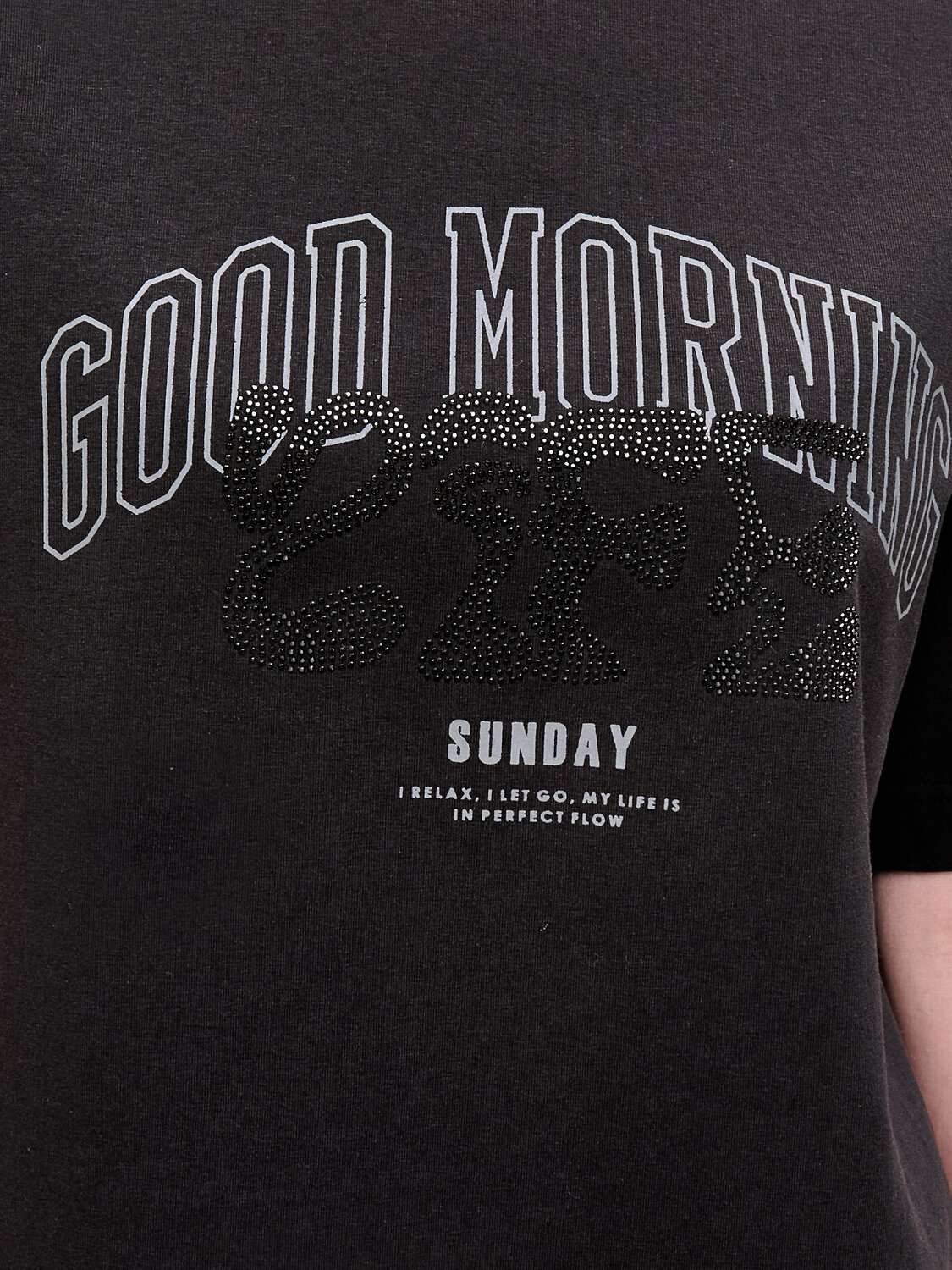 Женская футболка с принтом среднего объёма с коротким прямым рукавом. Вырез горловины обработан окантовкой. Изделие неприхотливо в уходе. Хлопковая футболка женская украшена принтом + актуальной аппликацией из мелких матовых страз. Шрифты в трендовых стилях. Надписи переводятся: «доброе утро, жизнь», «воскресенье», «я расслабляюсь, я отпускаю всё, моя жизнь течёт своим чередом». Принт и аппликация устойчивые, прочные, хорошо переносят многочисленные стирки. В составе ткани преобладает высококачественный хлопок — майка мягкая, воздухопроницаемая, приятная на ощупь. Футболка с надписями выполнена в трендовых и при этом универсальных цветах, которые отлично сочетаются с различными брюками, шортами. Футболки с принтом женские подходят также девушкам, девочкам-подросткам. Хлопковая футболка идеальна для любого времени года, её можно носить как летом, так и в холодное время года в качестве среднего слоя одежды, а также на спорт. Помните о правильном уходе за изделием: рекомендуется стирать при температуре не выше 30 °C, без предварительного замачивания, с изнанки. Это поможет сохранить качество и цвет футболки на длительное время. Не забывайте о выборе правильного размера. Используйте таблицу размеров на фотографии, чтобы выбрать подходящий для себя вариант. Обратите внимание, что цвет товара на экране вашего устройства может отличаться от реального.