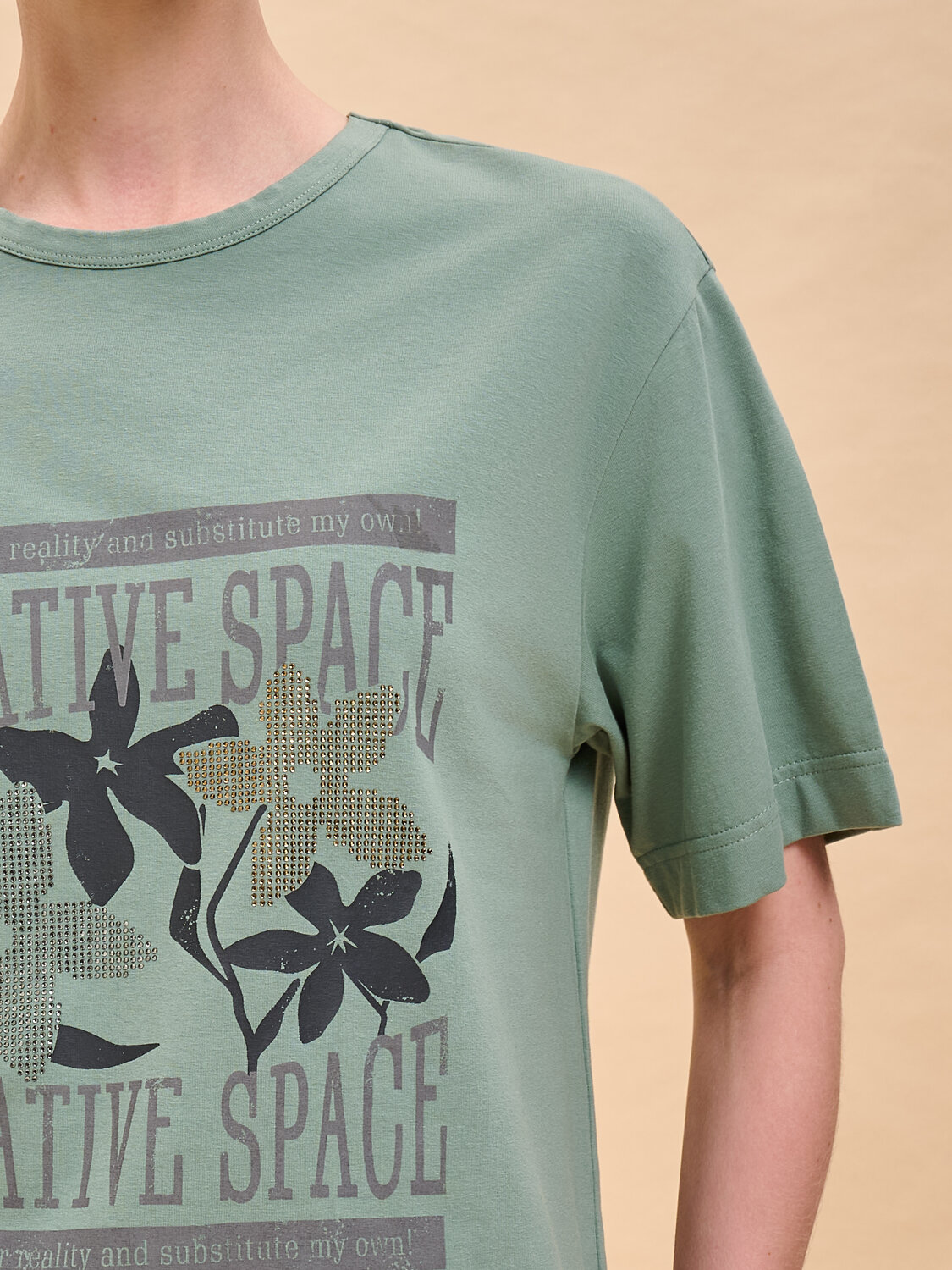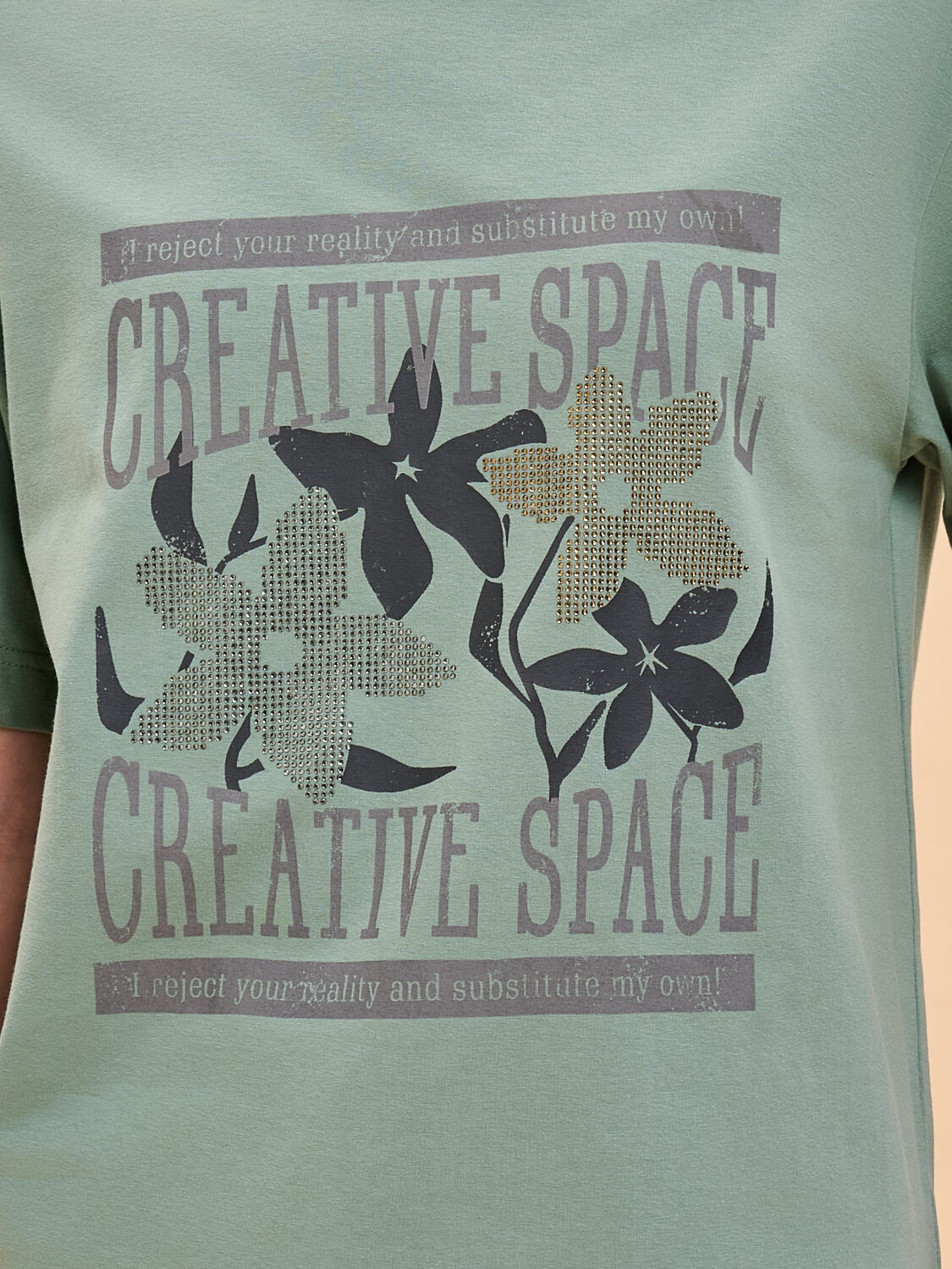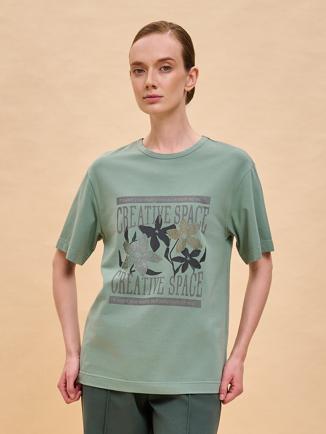 Женская футболка с принтом среднего объёма с коротким прямым рукавом. Вырез горловины обработан окантовкой. Изделие неприхотливо в уходе. Хлопковая футболка женская украшена принтом + актуальной аппликацией из мелких страз. Шрифты в трендовом стиле + цветы. Надписи переводятся: «креативное пространство», «я отрицаю вашу реальность и создаю свою собственную!». Принт и аппликация устойчивые, прочные, хорошо переносят многочисленные стирки. В составе ткани преобладает высококачественный хлопок — майка мягкая, воздухопроницаемая, приятная на ощупь. Футболка с надписями выполнена в трендовых и при этом универсальных цветах, которые отлично сочетаются с различными брюками, шортами. Футболки с принтом женские подходят также девушкам, девочкам-подросткам. Хлопковая футболка идеальна для любого времени года, её можно носить как летом, так и в холодное время года в качестве среднего слоя одежды, а также на спорт. Помните о правильном уходе за изделием: рекомендуется стирать при температуре не выше 30 °C, без предварительного замачивания, с изнанки. Это поможет сохранить качество и цвет футболки на длительное время. Не забывайте о выборе правильного размера. Используйте таблицу размеров на фотографии, чтобы выбрать подходящий для себя вариант. Обратите внимание, что цвет товара на экране вашего устройства может отличаться от реального.