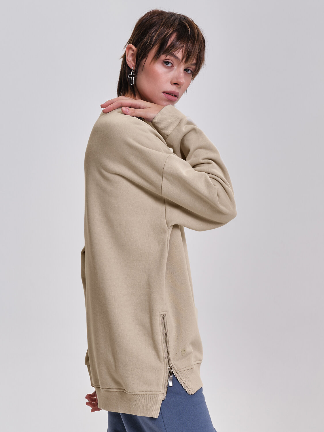 Свитшот женский без начеса. Толстовка расслабленного силуэта-кокон со спущенным плечом подарит вам комфорт и станет стильным дополнением гардероба. Спинка джемпера длиннее переда — актуальный модный тренд. Манжеты, отделка горловины и низа изделия выполнены из эластичной широкой рибаны (ткани в рубчик). Она не растягивается, отлично сохраняет форму, при этом свитшот удобно надевать и снимать. Модель неприхотлива в уходе. Оверсайз свитшот выполнен из плотного и приятного на ощупь футера — в составе ткани преобладает высококачественный хлопок, ткань дышит. Полиэстер помогает сохранить цвет и первозданный внешний вид надолго. Женский свитшот выполнен в универсальных цветах, который легко сочетать с любыми брюками, джинсами, юбками, платьями — можно создать много красивых образов. Толстовка декорирована небольшим объёмным принтом в виде первой буквы логотипа бренда. Стильная фишка модели — в боковых швах разрезы на металлических молниях. Однотонный оверсайз-свитшот — базовый элемент повседневного женского гардероба. Свитшот без начеса можно носить круглый год. Помните о правильном уходе за изделием: рекомендуется стирать при температуре не выше 30 °C, без предварительного замачивания, с изнанки. Это поможет сохранить качество и цвет свитшота на длительное время. Не забывайте о выборе правильного размера. Используйте таблицу размеров на фотографии, чтобы выбрать подходящий для себя вариант. Обратите внимание, что цвет товара на экране вашего устройства может отличаться от реального.
