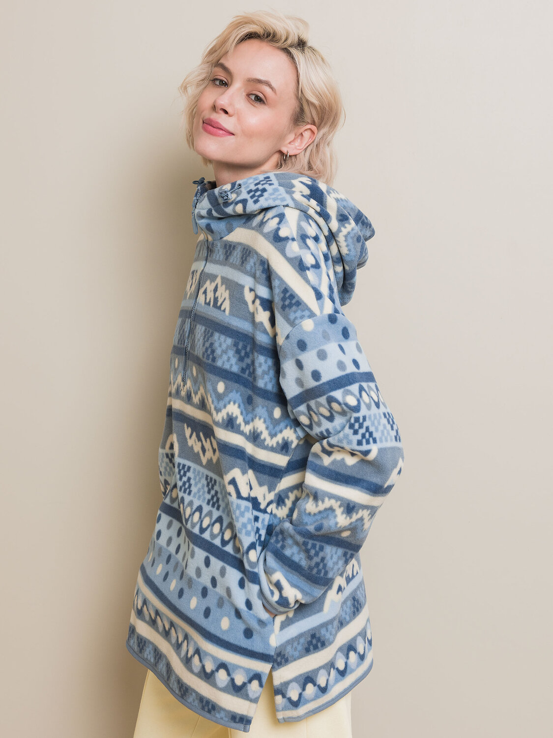 Худи женское – практичная, модная и теплая одежда из новой коллекции бренда Pelican. Толстовка с капюшоном, кулиской и молнией по горловине до середины груди универсальна. Ее можно надеть под верхнюю одежду, она не будет стеснять движений, можно комбинировать с другими моделями из зимней коллекции. У данной модели худи с капюшоном шнурки имеют карабины для фиксации нужной длины. Толстовка женская на молнии с капюшоном не требует особого ухода. Материал изделия (флис) после стирки не растягивается, не линяет. Быстро сохнет, что очень удобно в поездках за город на каникулы с детьми и семьей. На рукавах и по низу худи – оригинальный кант из ткани в тон основного материала. Эта кофта с замком по горловине точно станет любимой вещью вашего гардероба. Толстовка женская будет защищать от ветра и непогоды и отлично сочетается с брюками, треггинсами из теплой ткани, курткой или пальто. Новые модели выполнены в приятной палитре. Эта толстовка в оттенках голубого цвета с орнаментом по мотивам гор. Флисовая толстовка женская точно понравится любой девушке, девочке-подростку и женщине. Худи оверсайз не сковывает движений при занятиях зимним спортом. Такую вещь также можно подарить на Новый год или Рождество в качестве заботливого подарка, устроить фотосессию в стиле сканди. Только представьте, как уютно можно укутаться в теплый и мягкий флис зимним вечером или утеплиться на снежную прогулку с семьей.