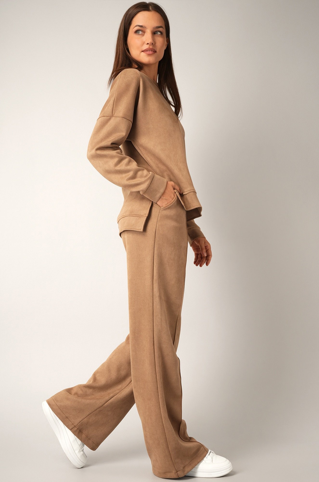 Женский костюм двойка, который влюбляе..показатьт с первого взгляда! Мягкая экозамша, уютный лонгслив и широкие штаны палаццо создают образ, в котором захочется провести весь день. Универсальный вариант для девушек и женщин, который легко подстраивается под ритм осени и весны.