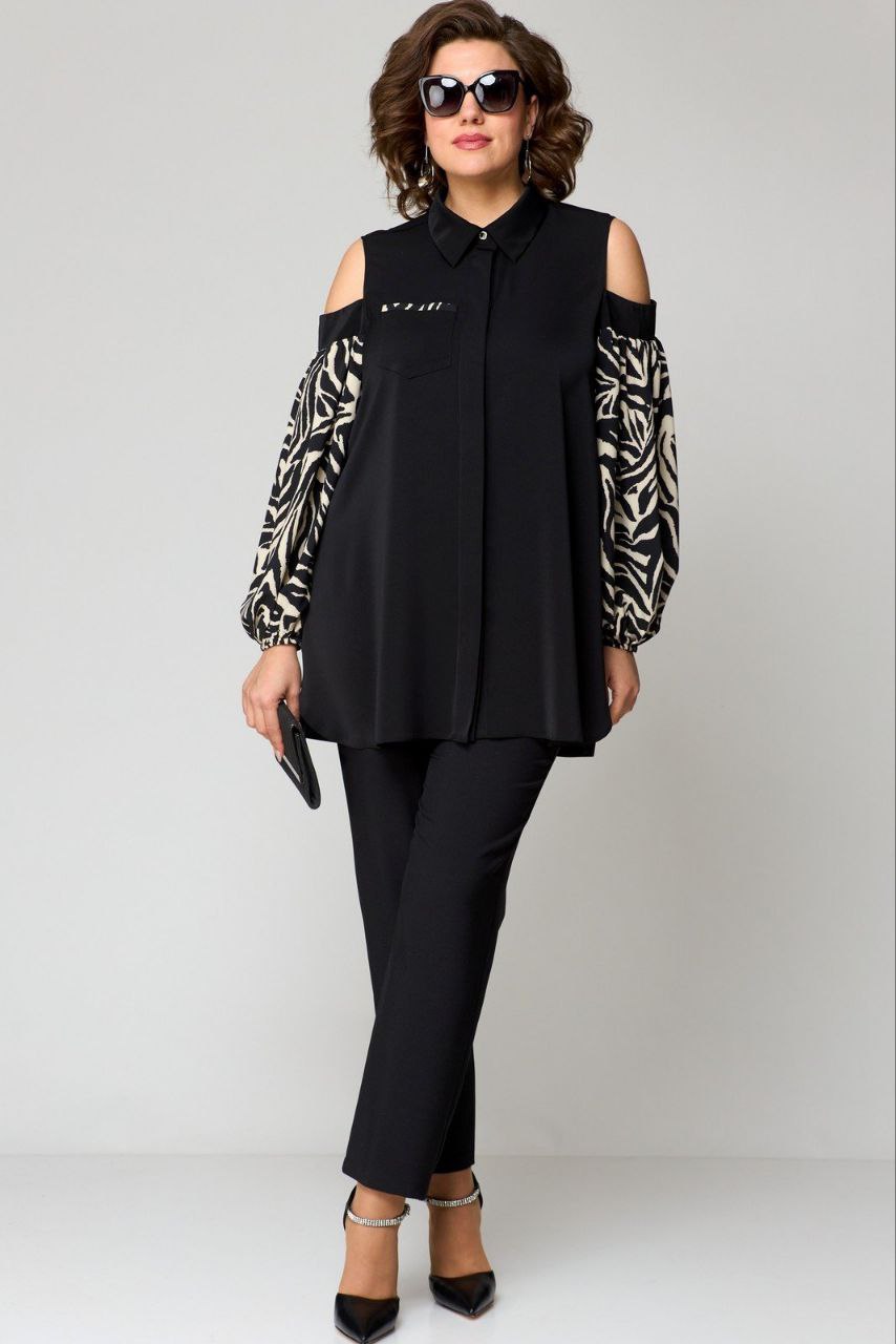 Блуза женская нарядная А-образного силуэта выполнена из плательно-блузочной ткани в сочетании с креп-шифоном. Вырез горловины воротник на стойке рубашечного типа. Застежка потайная доверху на обметанные петли и пуговицы. Рукав втачной из креп-шифона с открытым плечом со сборкой по вурху и по низу. Низ рукава собран на резинку. В боковых швах обработаны разрезы. По правой полочке накладной карман. Декором служит принт на ткани рукавов и отделка по карману.