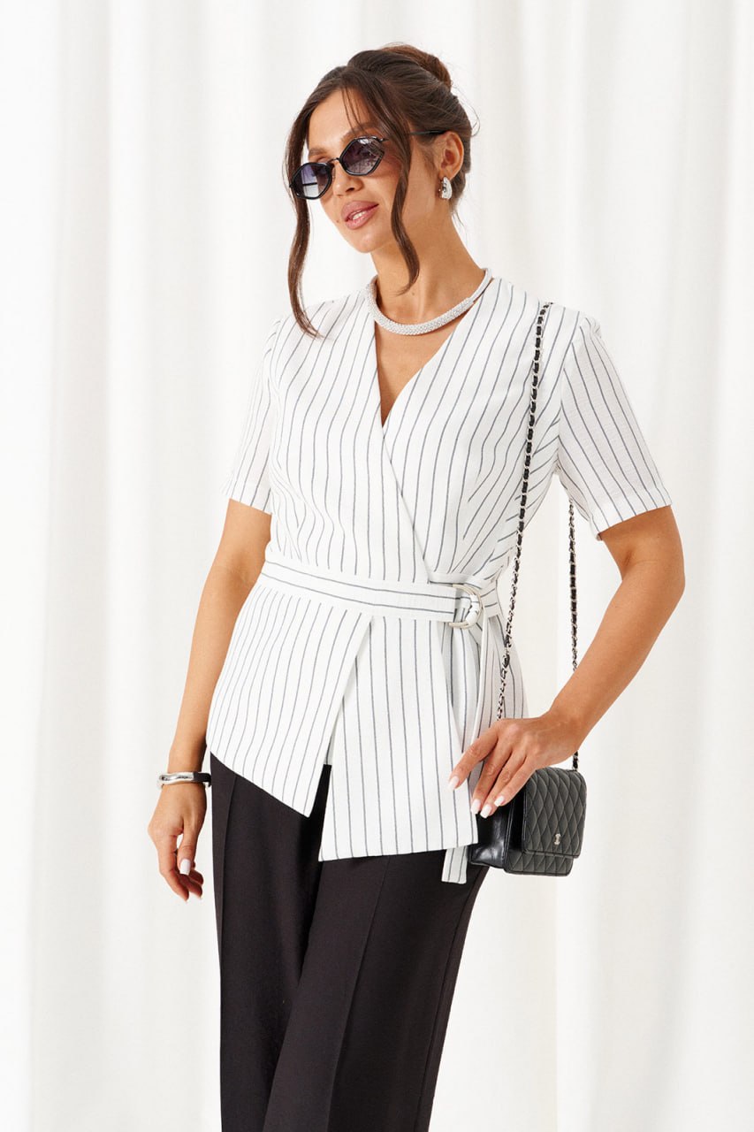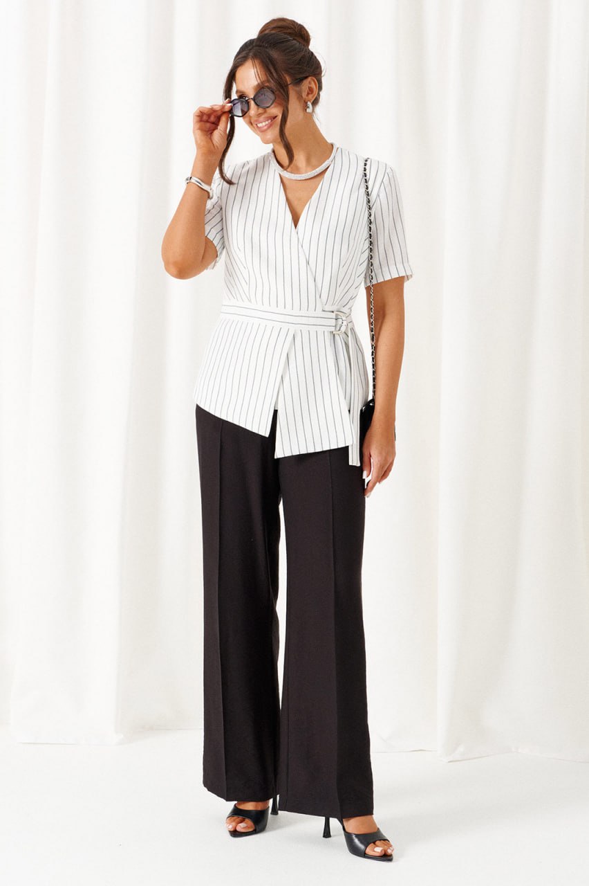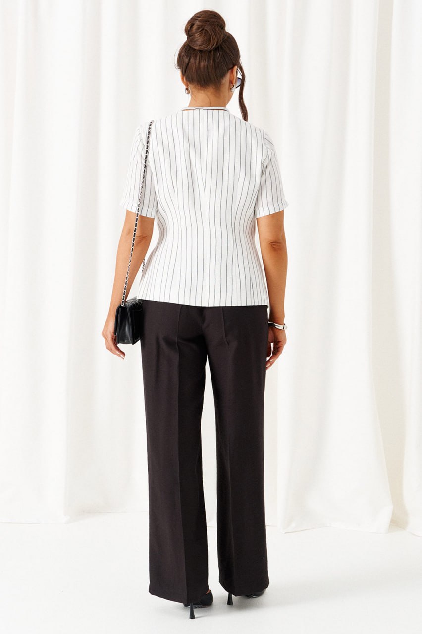 Комплект женский 2-ух предметный: жакет и брюки в деловом стиле. Выполнен из льняного полотна с содержанием вискозной нити. Жакет прилегающего силуэта на подкладке. Передняя часть с горизонтальным подрезом в виде декоративного пояса. Верхняя часть переда с двумя боковыми рельефами и дополнительными вытачками на уровне талии. Нижняя часть переда с декоративными подрезными вставками. Спинка разрезная по среднему шву и с дополнительными вытачками на линии талии и горловины. V- образный вырез горловины. Рукав короткий втачной одношовный. Застежка двубортная на декоративные пряжку в виде полуколец и пояс, и потайные петлю и пуговицу. Брюки классические, свободные с боковыми подрезами, имитирующими карманы. Посадка классическая. В задней части пояса для удобства использования вставлена резинка. Застежка центральная на молнию и петлю с пуговицей на поясе. Длина жакета (по среднему шву спинки) – 60 см. Длина рукава – 26,5 см. Длина брюк (по боковому шву с поясом) –108 см.