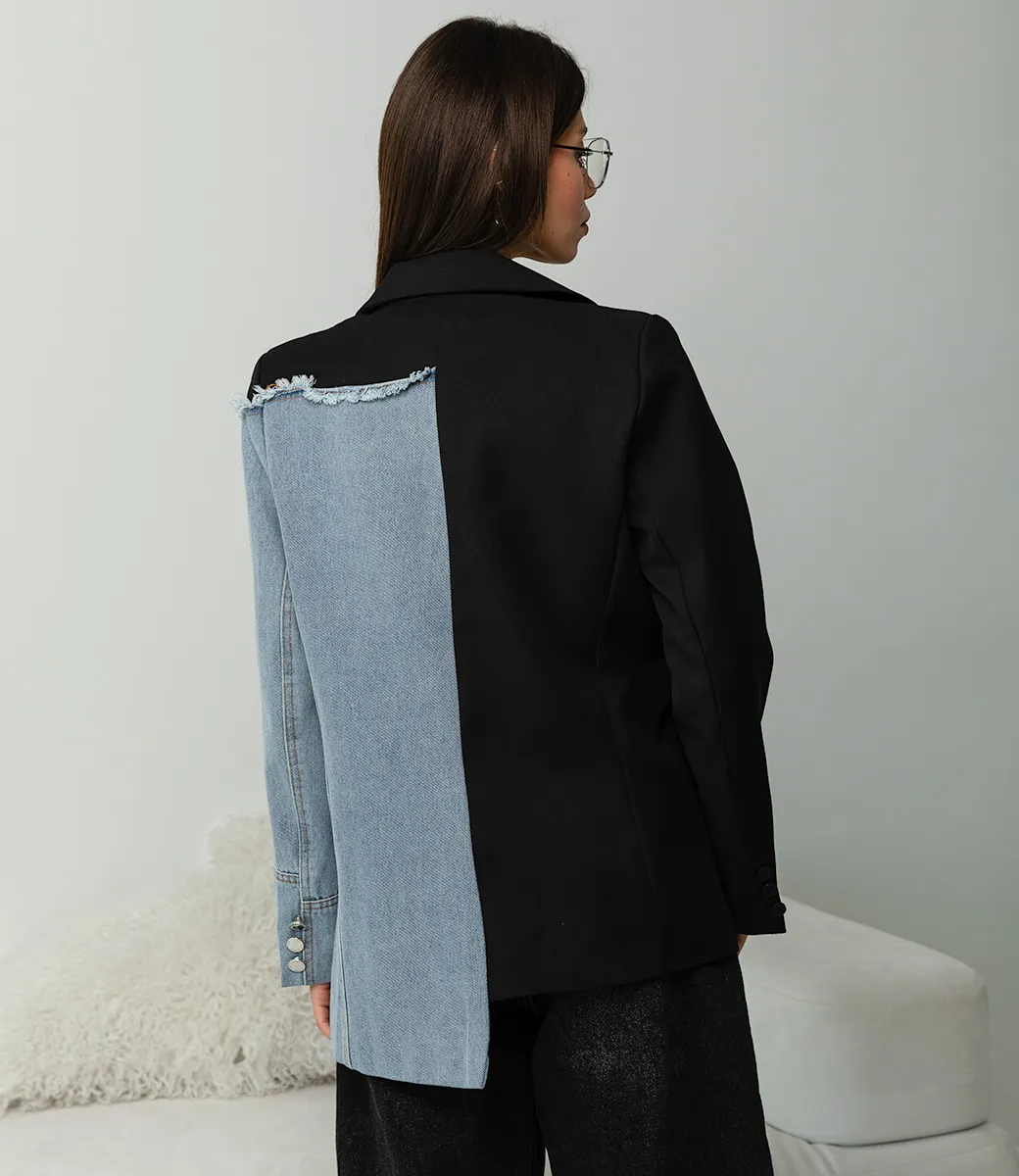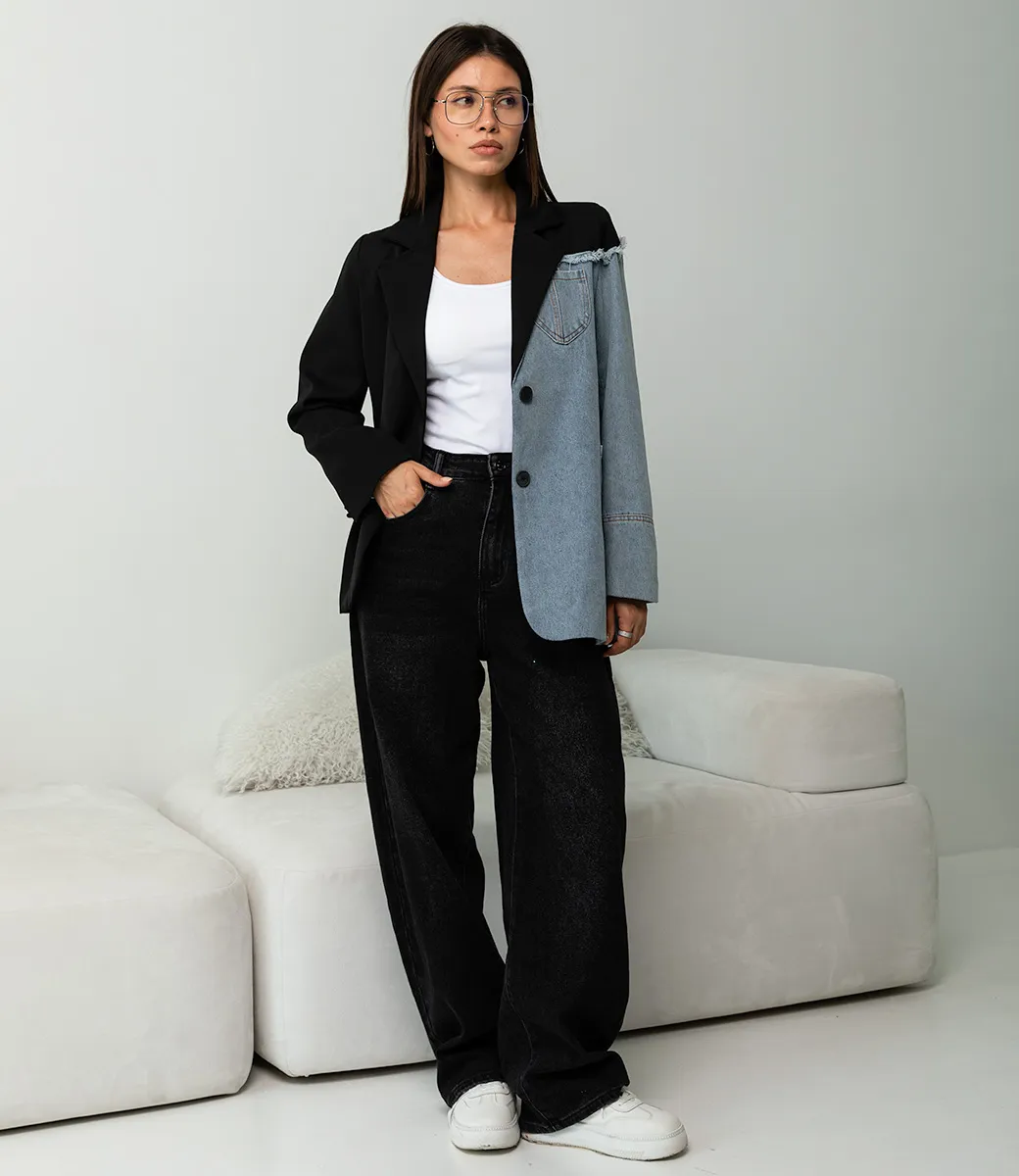 Пиджак — это уникальный элемент гардероба, который привносит в стиль каждой женщины уверенность и индивидуальность. Эта модель с ассиметричным дизайном создана для тех, кто стремится выделиться из толпы и подчеркнуть свою исключительность. Левая сторона пиджака выполнена из классической ткани, оформлена аккуратным отложным воротником и застёжкой на две пуговицы, что подчеркивает изысканность и строгость образа. Правая сторона, напротив, изготовлена из джинсовой ткани с характерной строчкой, джинсовым карманом и необработанным краем на уровне плеча, придавая изделию креативный и модный вид. Длинные рукава, каждый из которых выполнен из соответствующих материалов, добавляют оригинальности и позволяют носить пиджак в разных стилевых комбинациях. Свободный силуэт и прямой крой обеспечивают комфорт и свободу движений, так что вы сможете легко сочетать его как с формальными, так и с повседневными вещами. Подходящий для смелых и стильных образов, этот пиджак объединяет в себе элементы классики и денима, позволяя каждой женщине создать неповторимый лук для любого случая. Такие оригинальные модели привлекают особое внимание и станут идеальным дополнением к вашему ассортименту. Изготовлен из высококачественного материала (35% хлопка и 65% полиэстера), пиджак гарантирует долговечность и безупречный внешний вид даже после многократных стирок. Не упустите возможность предложить вашим покупательницам стильный пиджак, который станет настоящим акцентом в их гардеробе. На нашем сайте вы сможете найти таблицу размеров для уверенности в выборе. Предложенная нами цена является приемлемой и открывает отличные возможности для оптовых закупок. Подарите своим клиентам возможность быть смелыми и стильными с этим уникальным пиджаком, который идеально сочетает формальный и повседневный стиль! Рост модели 164, 83-61-89.
