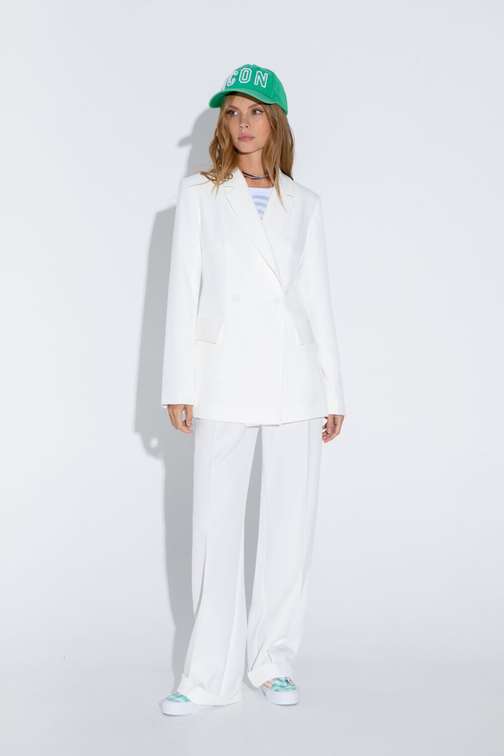 Текстильный костюм-двойка из двубортного полуприлегающего жакета и прямых брюк со стрелками. Детали: жакет с отрезными бочками и нагрудными вытачками, пиджачный воротник, прорезные карманы, застежка на петли и пуговицы, спинка со средним швом, втачные двухшовные рукава, жакет на подкладке. Брюки с высокой посадкой на притачном поясе со шлевками, передние половины с небольшими застроченными мягкими складками и заутюженными стрелками, застежка на молнию и пуговицу, боковые карманы