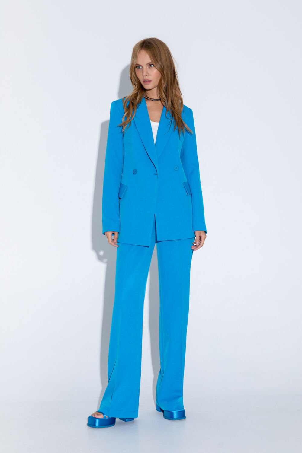 Текстильный костюм-двойка из двубортного полуприлегающего жакета и прямых брюк со стрелками. Детали: жакет с отрезными бочками и нагрудными вытачками, пиджачный воротник, прорезные карманы, застежка на петли и пуговицы, спинка со средним швом, втачные двухшовные рукава, жакет на подкладке. Брюки с высокой посадкой на притачном поясе со шлевками, передние половины с небольшими застроченными мягкими складками и заутюженными стрелками, застежка на молнию и пуговицу, боковые карманы