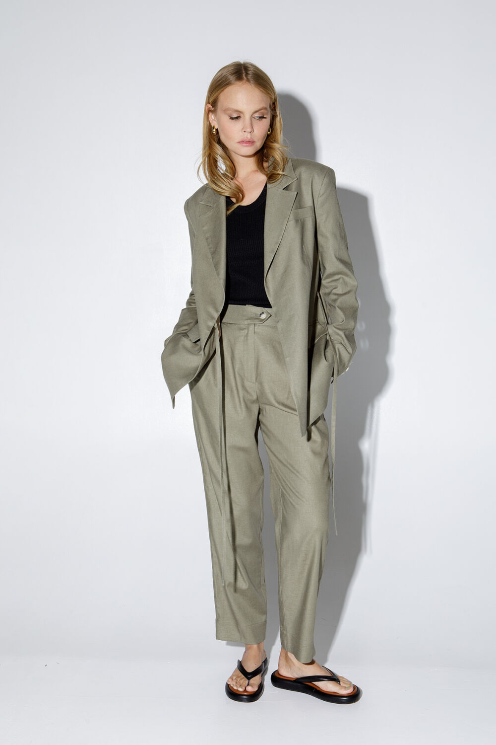 Льняной костюм-двойка из свободного жакета прямого силуэта и свободных брюк со складками. Детали: жакет прямого силуэта, отрезные бочки, пиджачный воротник, застежка-завязки, функциональные карманы, рукава и спинка со шлицами, жакет на подкладке из 100% хлопок. Брюки с высокой посадкой, притачной пояс со шлевками, задняя часть пояса эластичная- с резинкой, застежка на молнию и пуговицу, боковые карманы, передние половины с двумя складками.