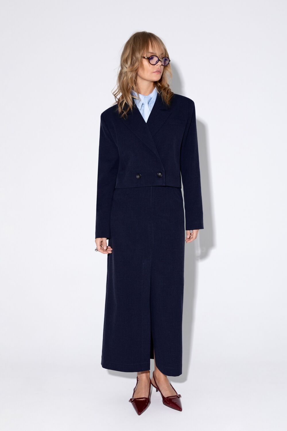 Костюм-двойка из укороченного оверсайз жакета с расширенной линией плеч и прямой макси-юбки с высоким разрезом.