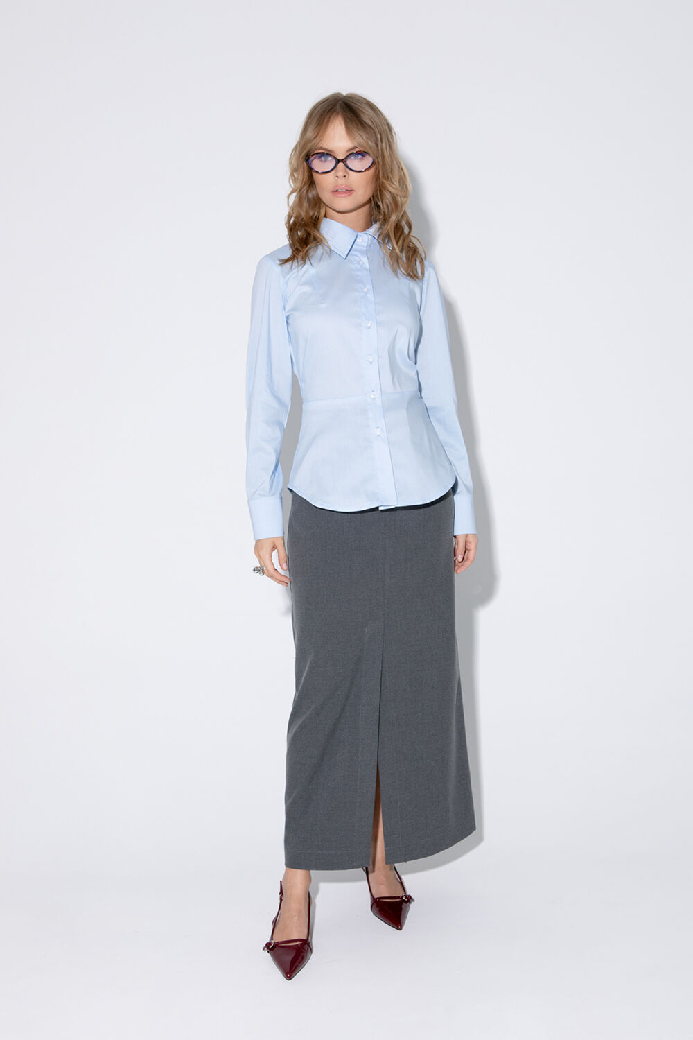 Комплект-двойка из приталенной хлопковой рубашки с галстуком и прямой макси-юбки с высоким разрезом.