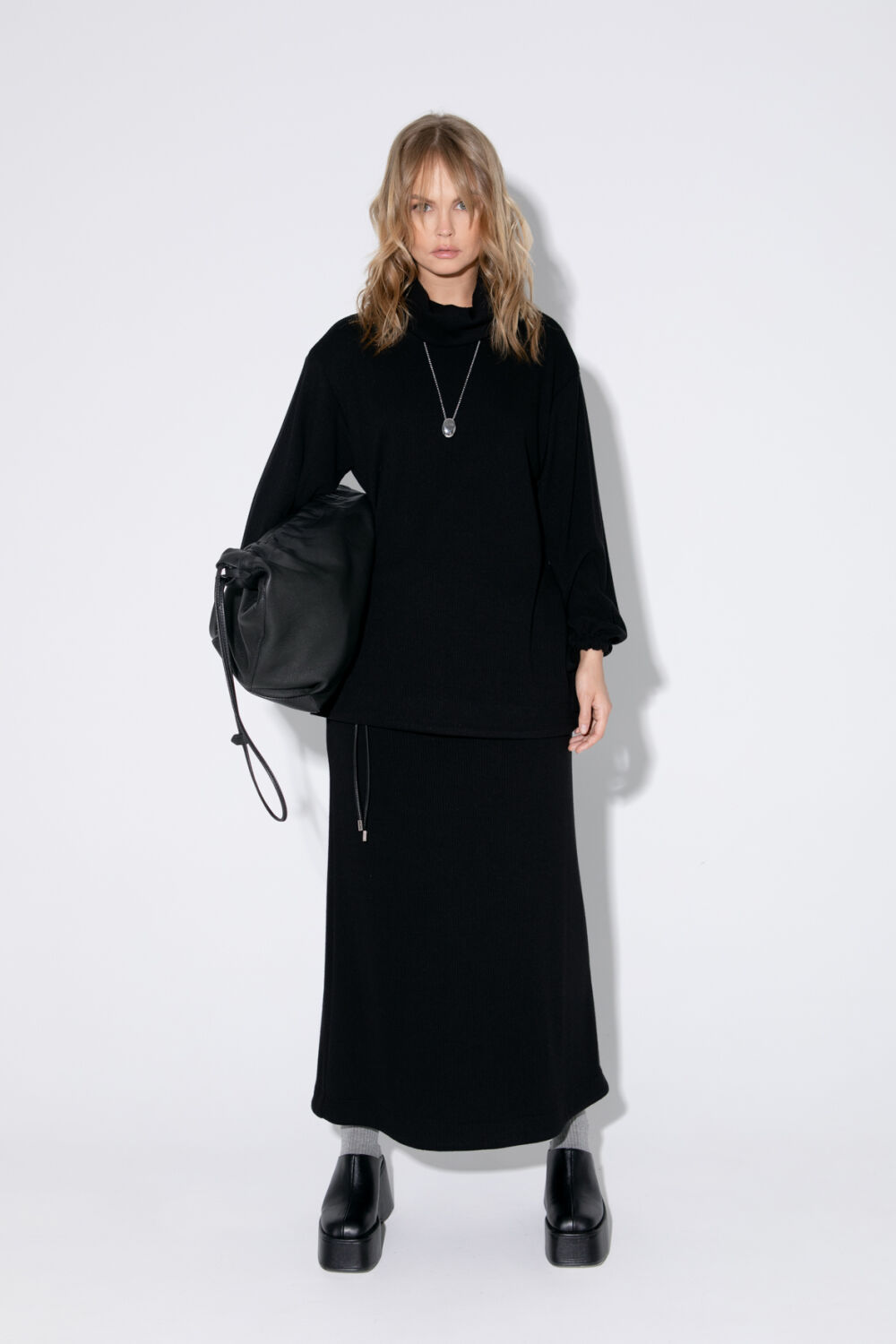 Трикотажный костюм-двойка из свободного джемпера с высоким воротником и макси-юбки.