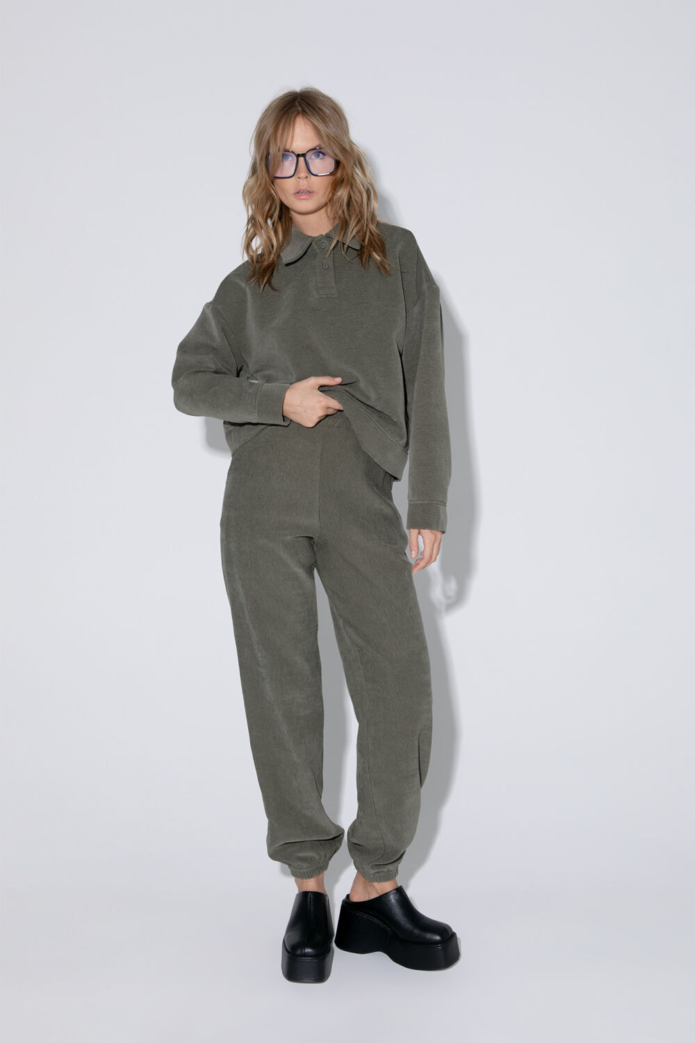 Костюм- двойка в спортивном стиле из свободного джемпера с воротником-поло и брюк-джоггеров из фактурной текстильной ткани в рубчик.