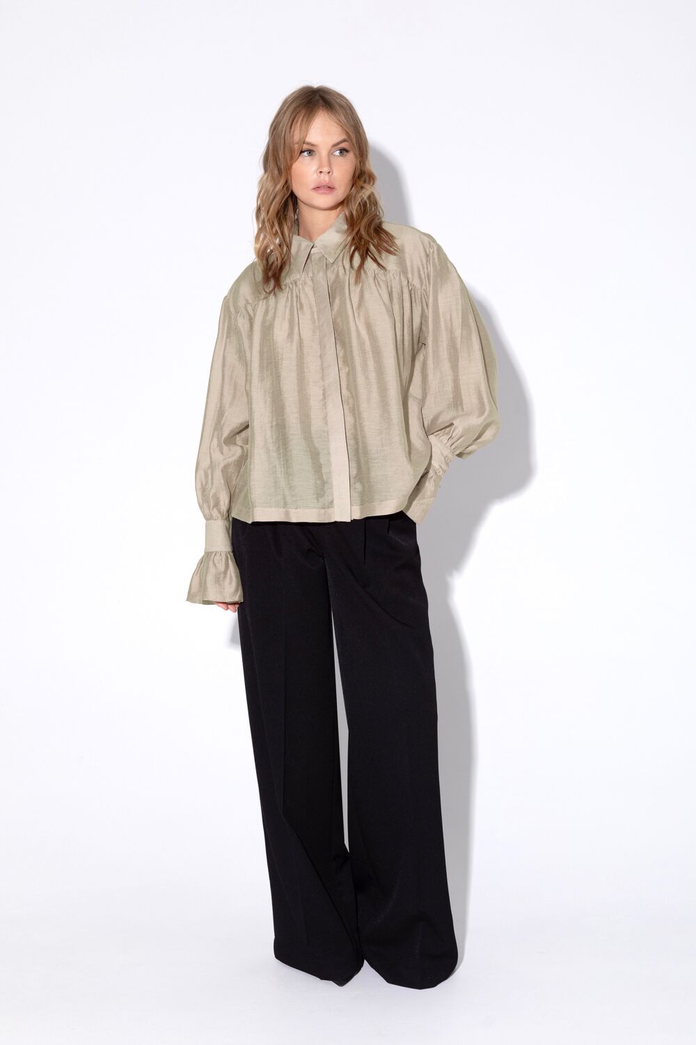 Комплект-двойка из свободной полупрозрачной блузы из вискозы и брюк-палаццо.