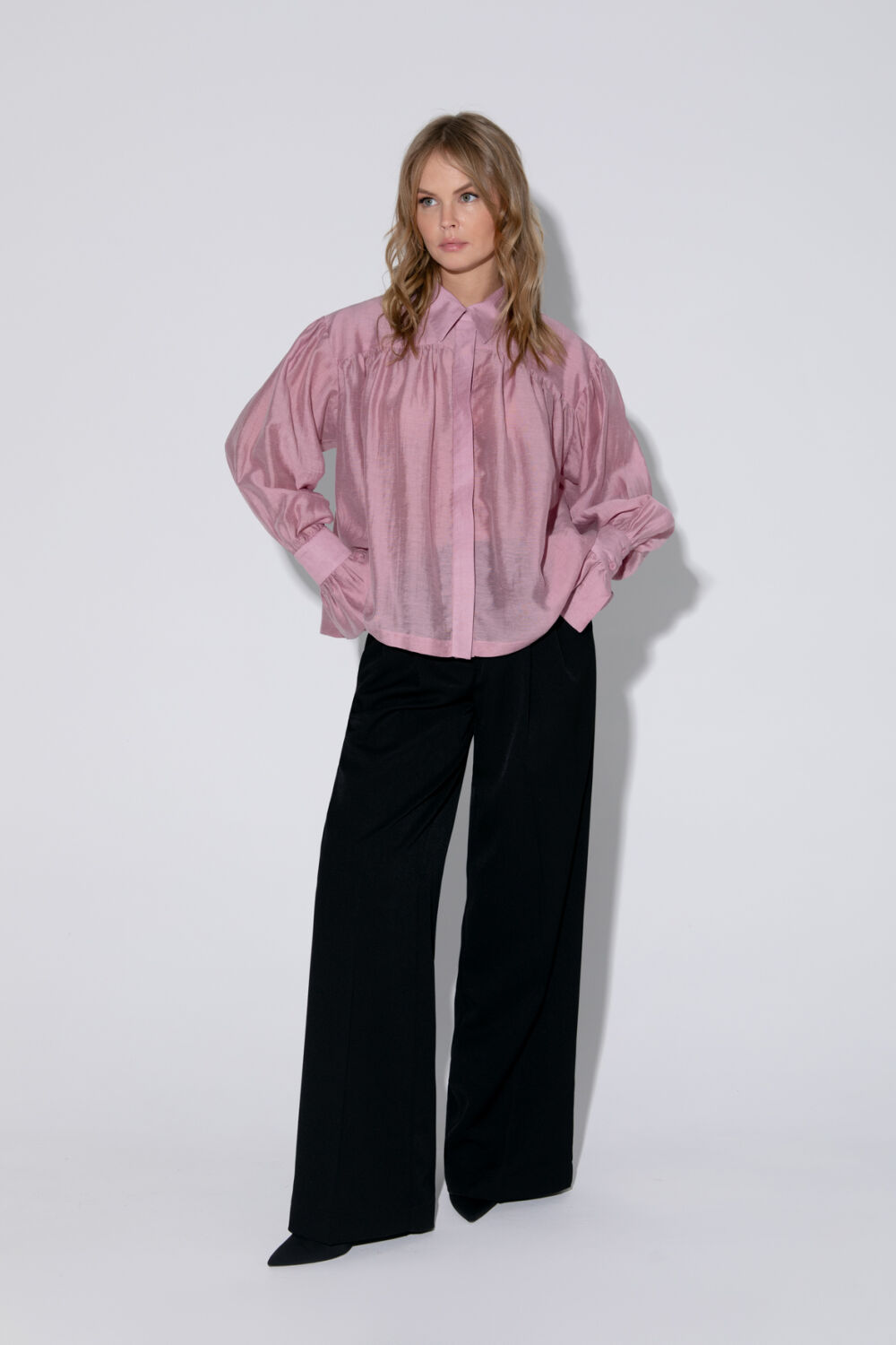 Комплект-двойка из свободной полупрозрачной блузы из вискозы и брюк-палаццо.