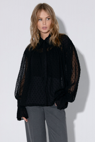 Комплект-двойка из свободной полупрозрачной блузы из струящегося текстиля и прямых брюк со стрелками.