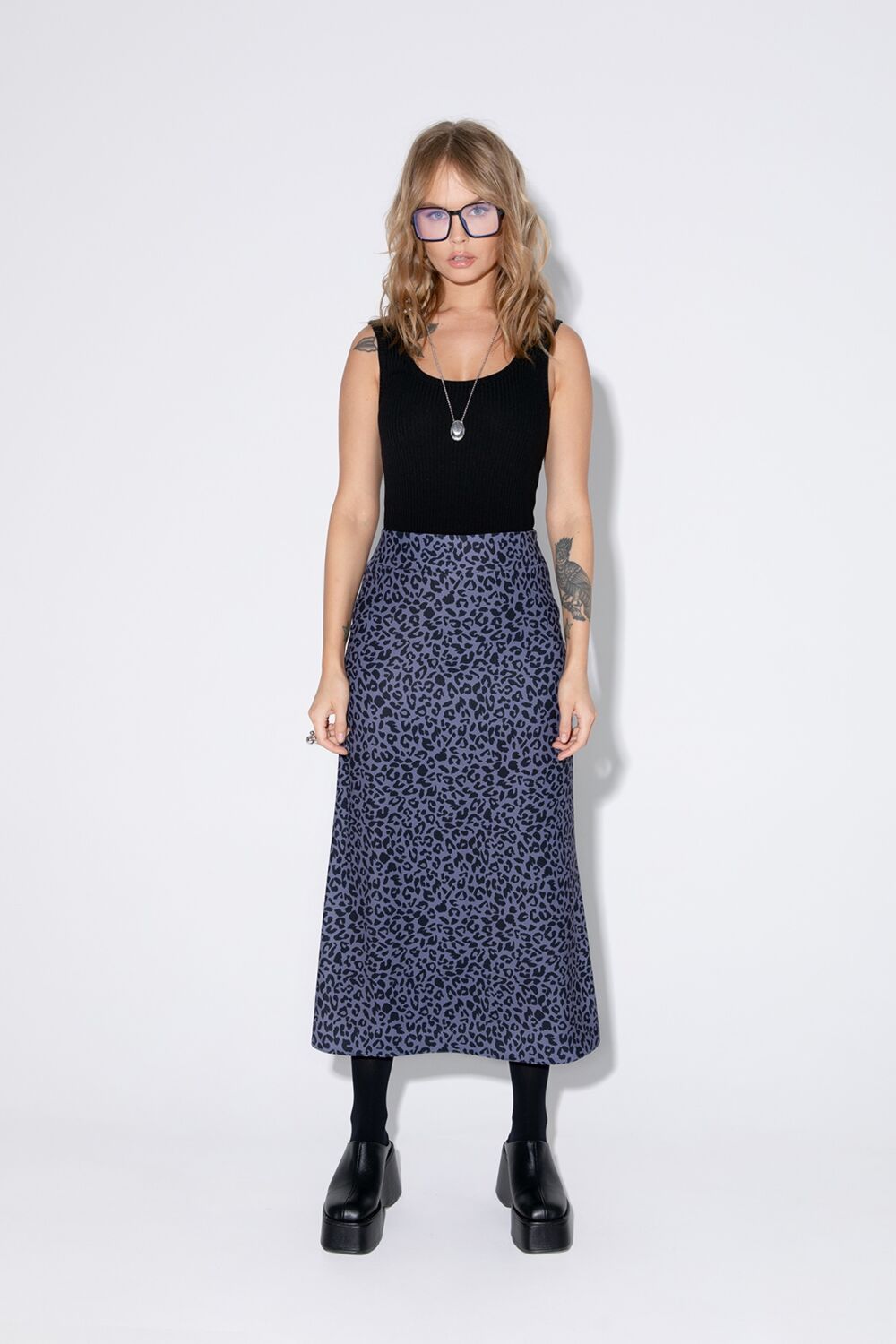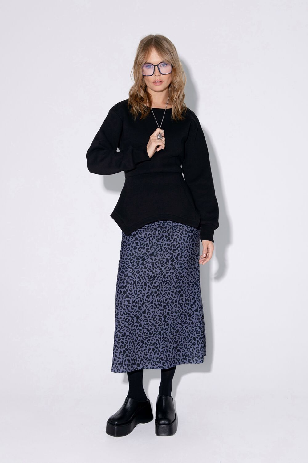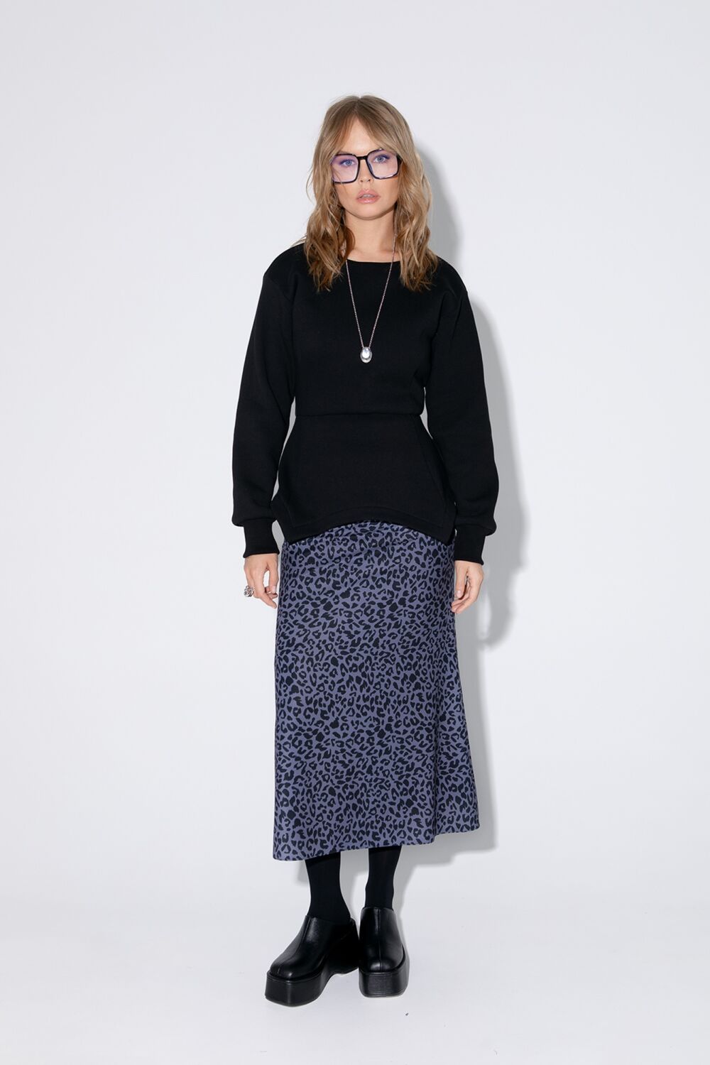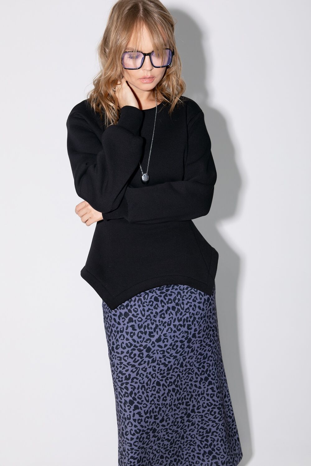 Комплект-двойка из трикотажного джемпера и текстильной юбки с анималистичным принтом.