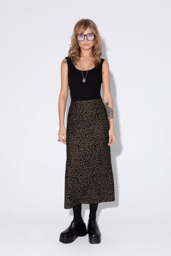 Комплект-двойка из трикотажной приталенной майки и текстильной юбки с анималистичным принтом.