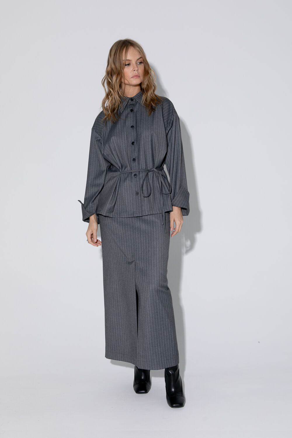 Костюм-двойка из свободной блузы и прямой макси юбки из костюмной ткани в тонкую полоску.