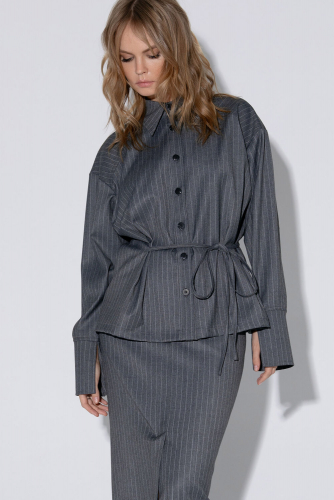 Детали: рубашка свободного кроя с расширенной линией плеч, рубашечный воротник, застежка на петли и пуговицы, асимметричные складки переда, длинные рукава с притачными широкими манжетами и разрезом по низу. Юбка на притачном поясе со шлевками, талиевые вытачки, боковые карманы, застежка на потайную молнию, на подкладке.