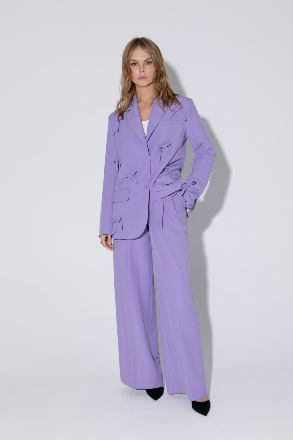Костюм-двойка из оверсайз жакета с бантиками и брюк-палаццо.