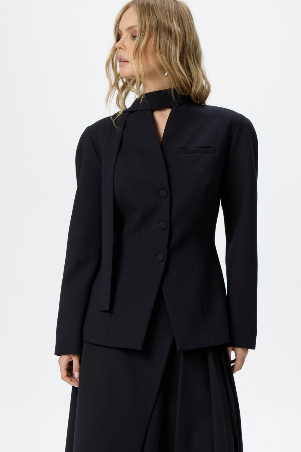 Костюм-двойка из приталенного жакета с акцентными плечами и асимметричной юбки со складками.екс-4%; Подкладка- Вискоза-55%; ПЭ-45%;