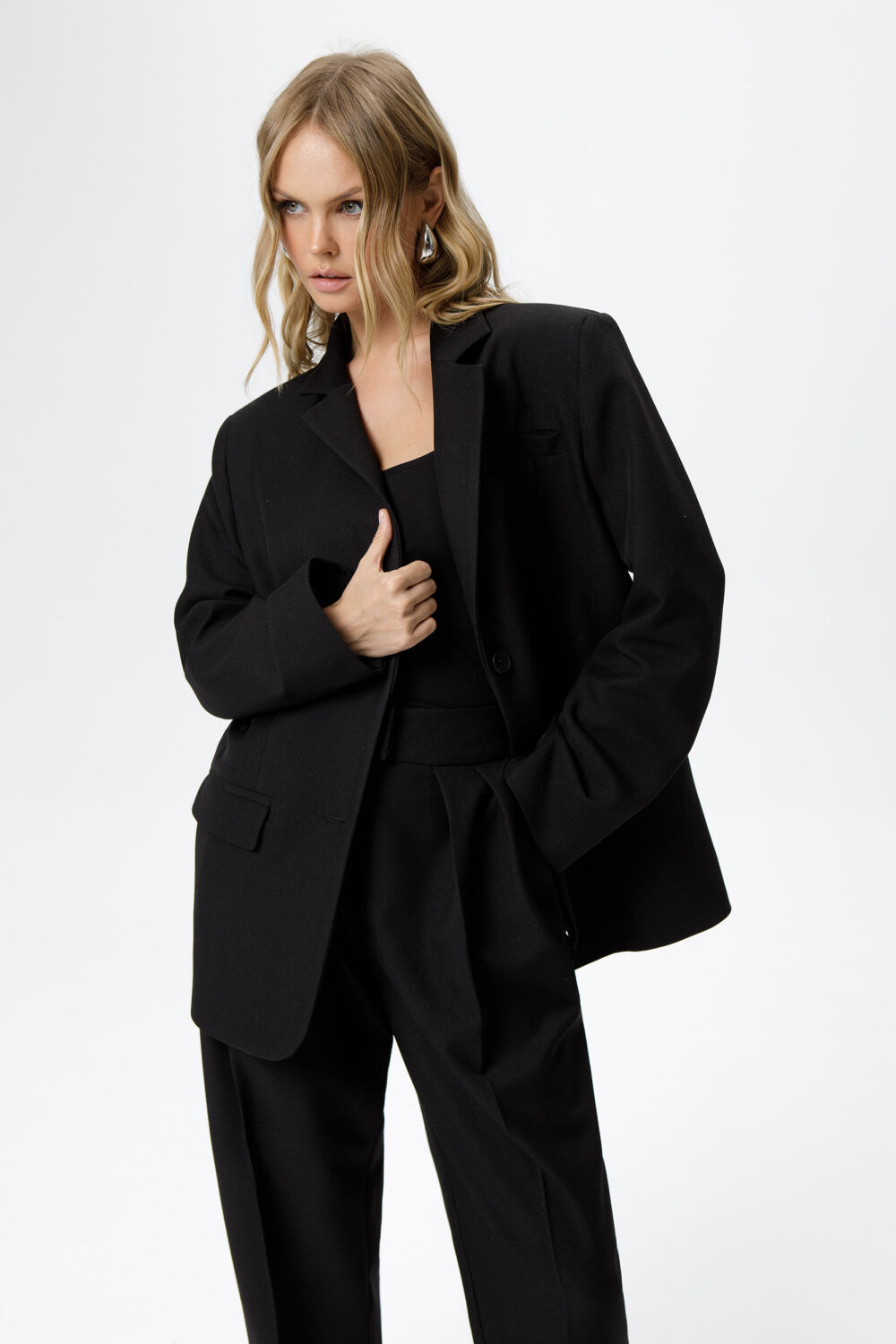 Костюм-двойка из оверсайз жакета и брюк со складками из костюмной ткани в рубчик.екс-5%; Подкладка- Вискоза-45%; ПЭ-55%;