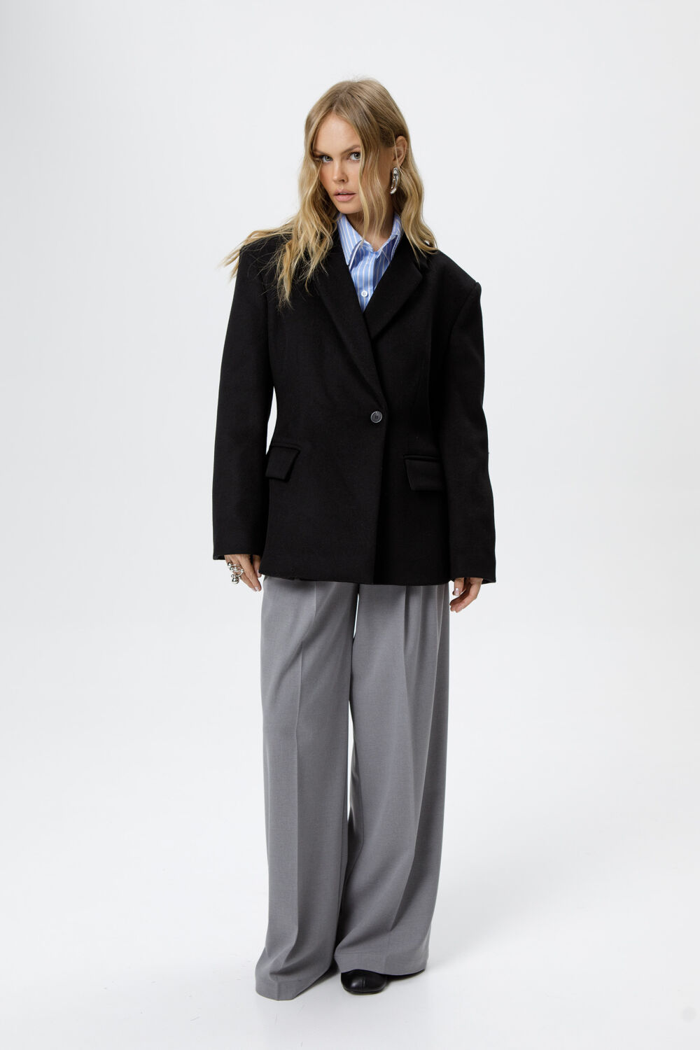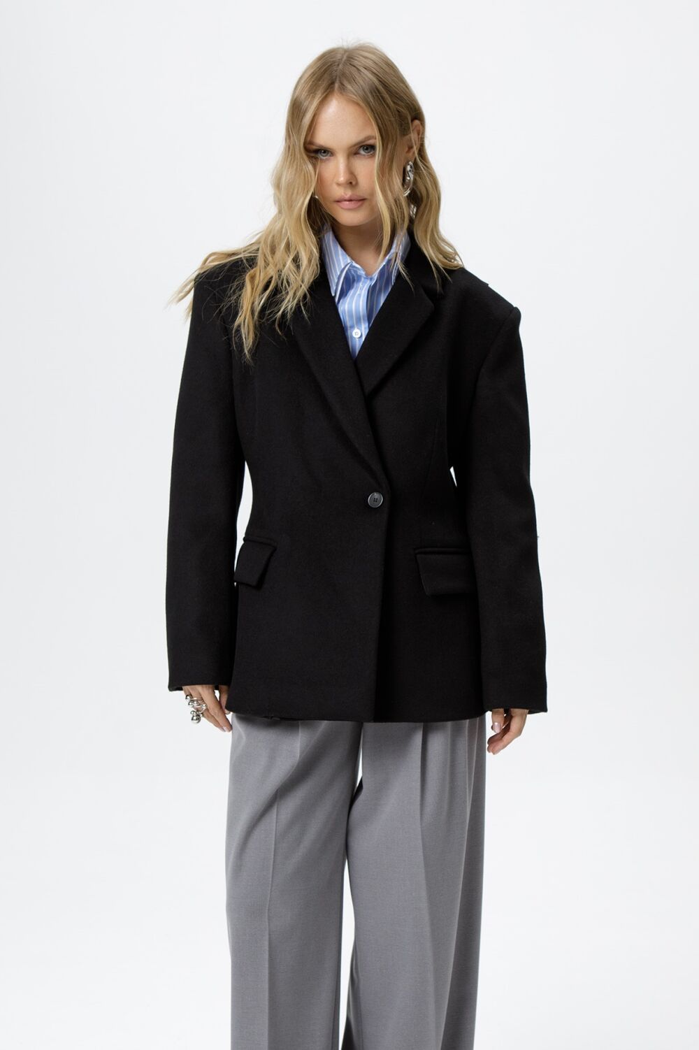 Детали: полуприлегающий силуэт, расширенные плечи, пиджачный воротник, талиевые вытачки переда и спинки, застежка на петли и пуговицы, функциональные карманы, на подкладке.