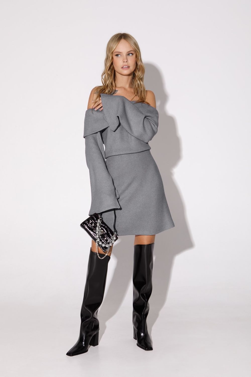 Трикотажное платье длины мини. Детали: полуприлегающий силуэт, отрезная линия талии с резинкой, длинные рукава со разрезами по низу, без застежкиесна