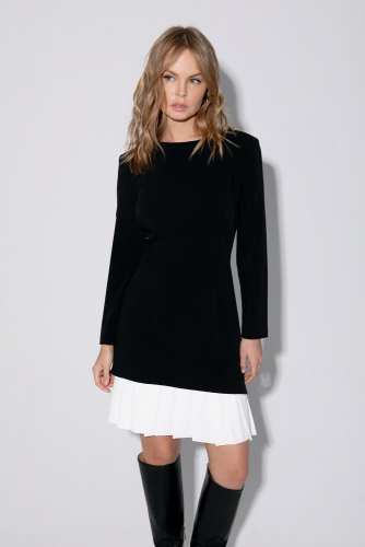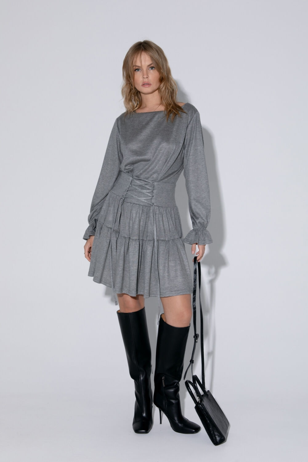 Детали: отрезная линия талии, пояс-кокетка с регулируемой шнуровкой, рукава втачные длинные, платье без застежки