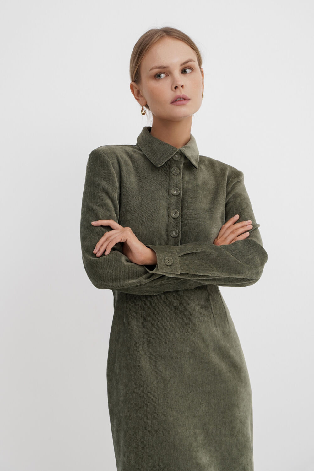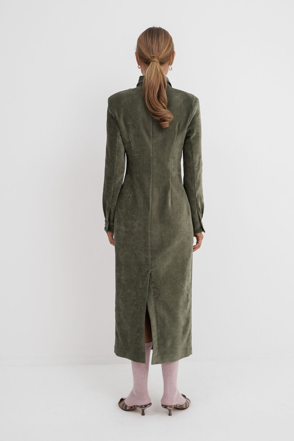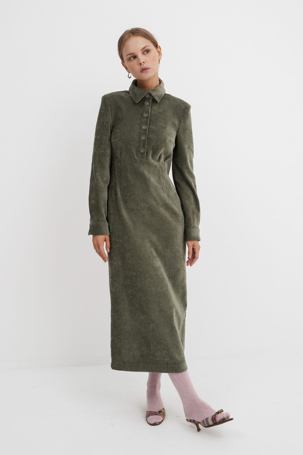 Приталенное платье-поло длины миди из бархатистой ткани.
