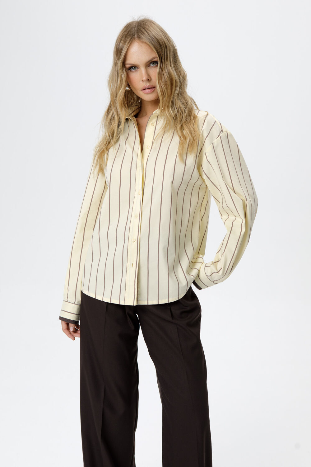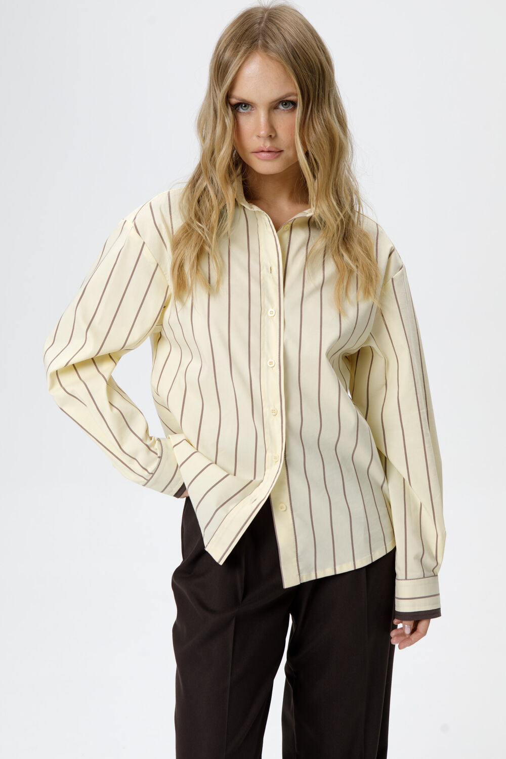 Хлопковая свободная рубашка в полоску с двойными воротниками и манжетами.i>