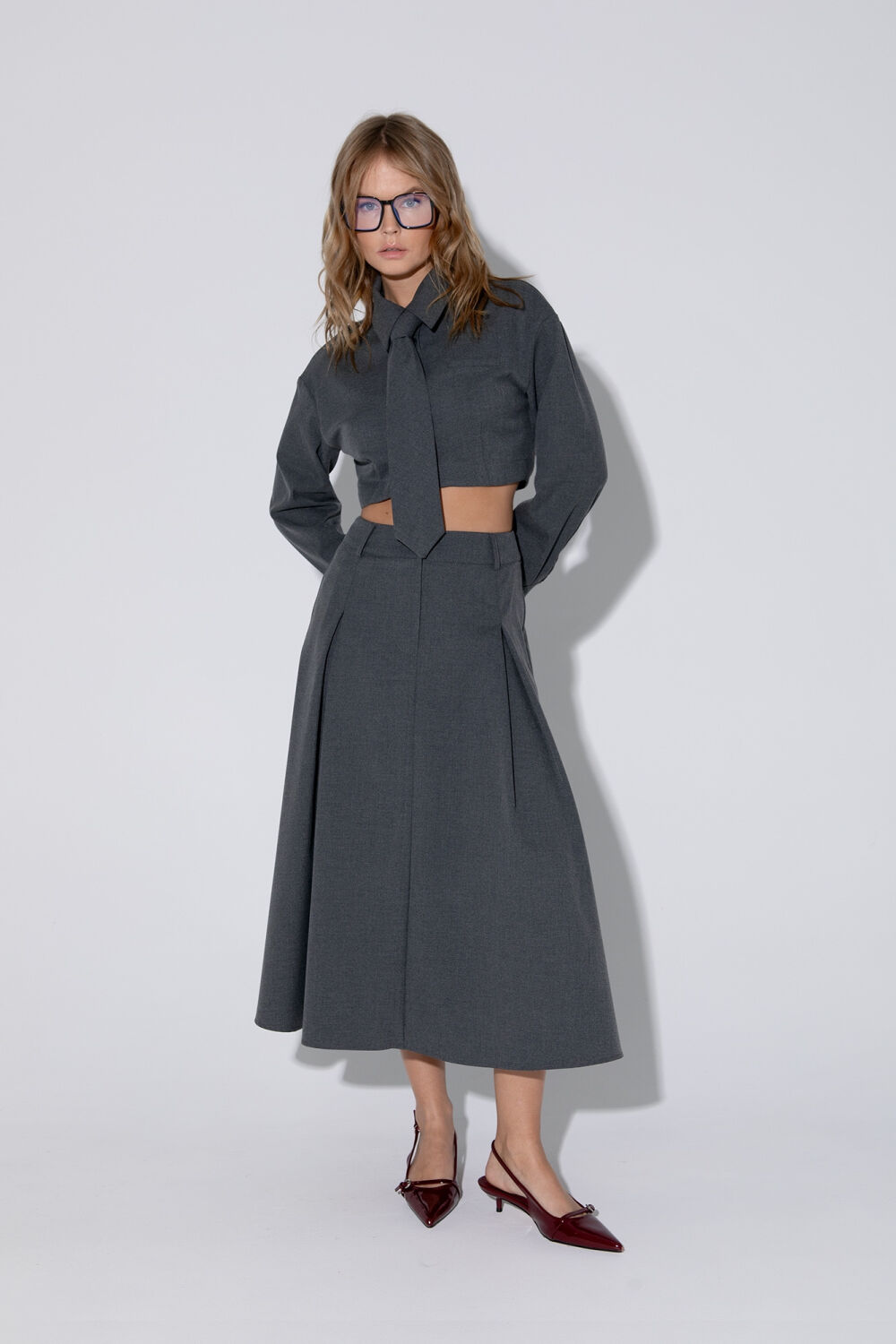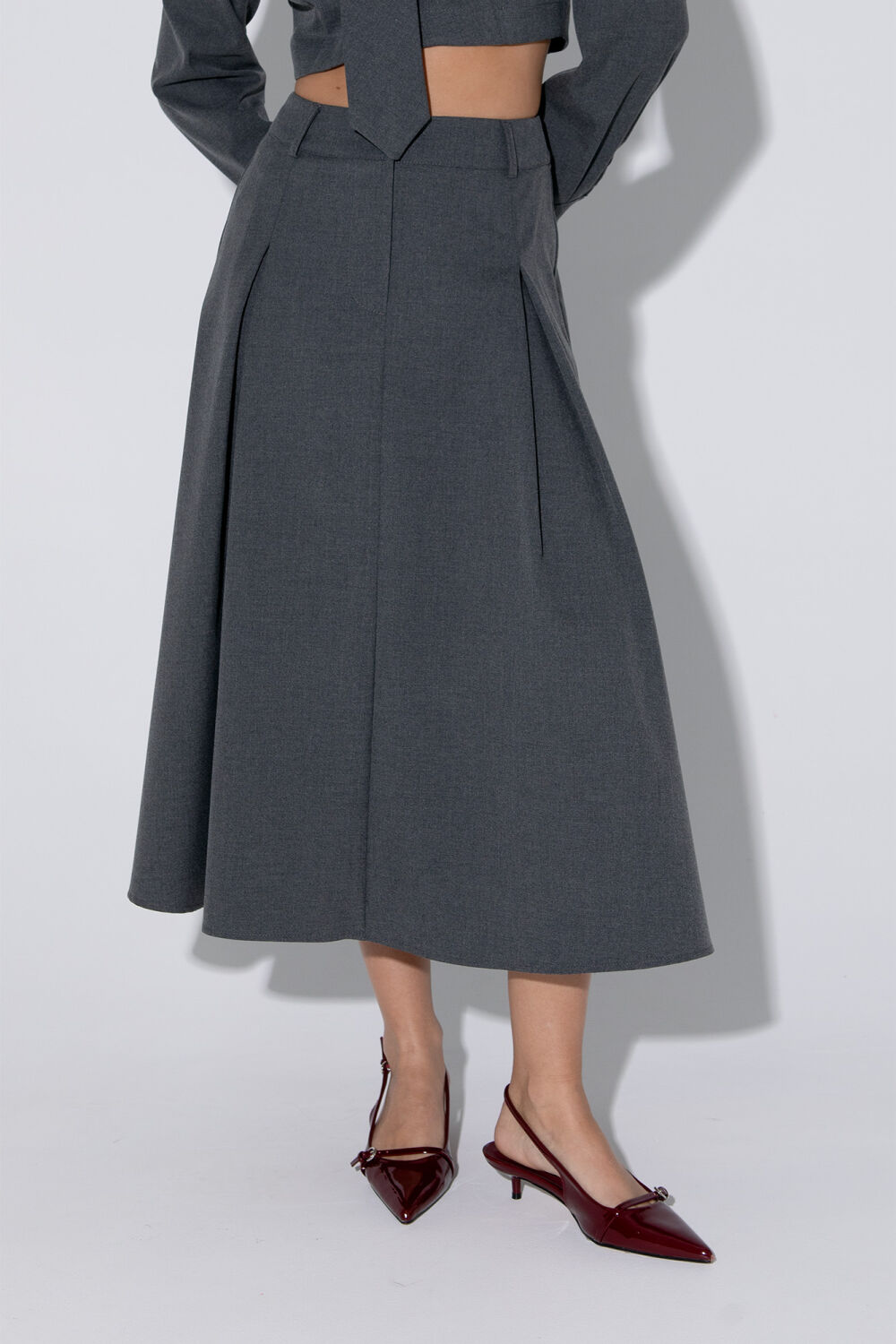 Детали: юбка на притачном поясе со шлевками, складки, застежка на молнию по переду, имитация карманов в рамку по задним частям юбки, без подкладки.